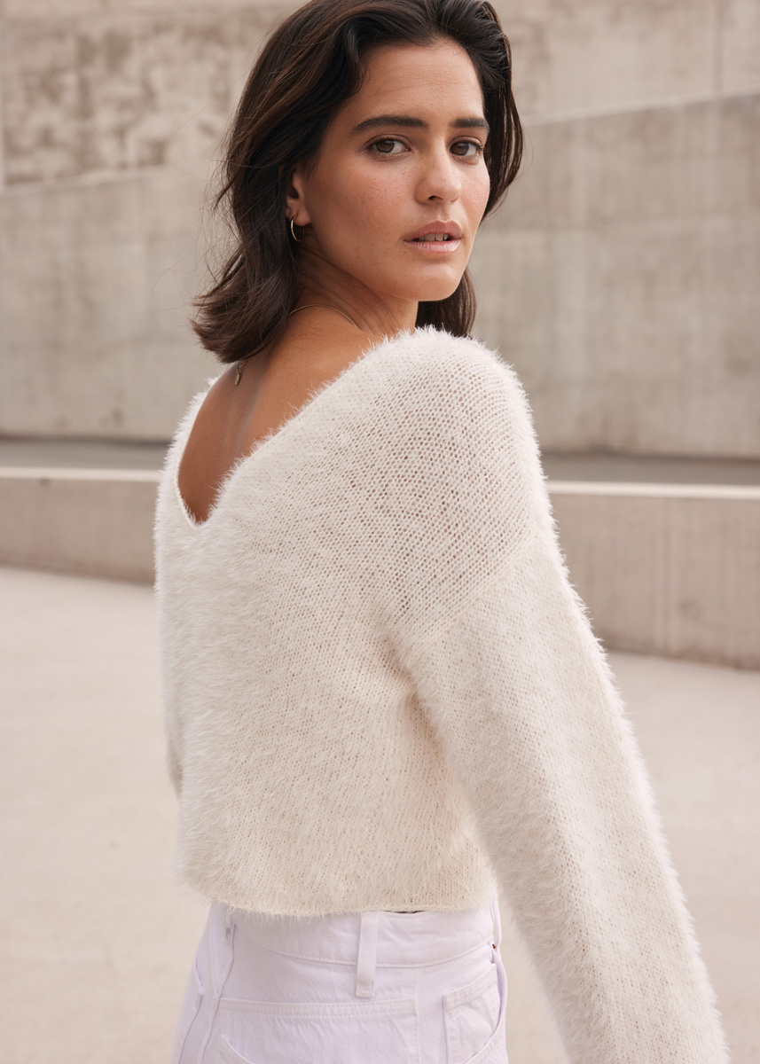 Lana Grossa „Per Fortuna“ (74% bomull (bio), 26% polyamid, löplängd 190 m/50 g), 250 (300 – 350) g ecru (färg 8); stickor nr. 4,5 och 1 rundsticka nr. 4,5, 40 cm lång.