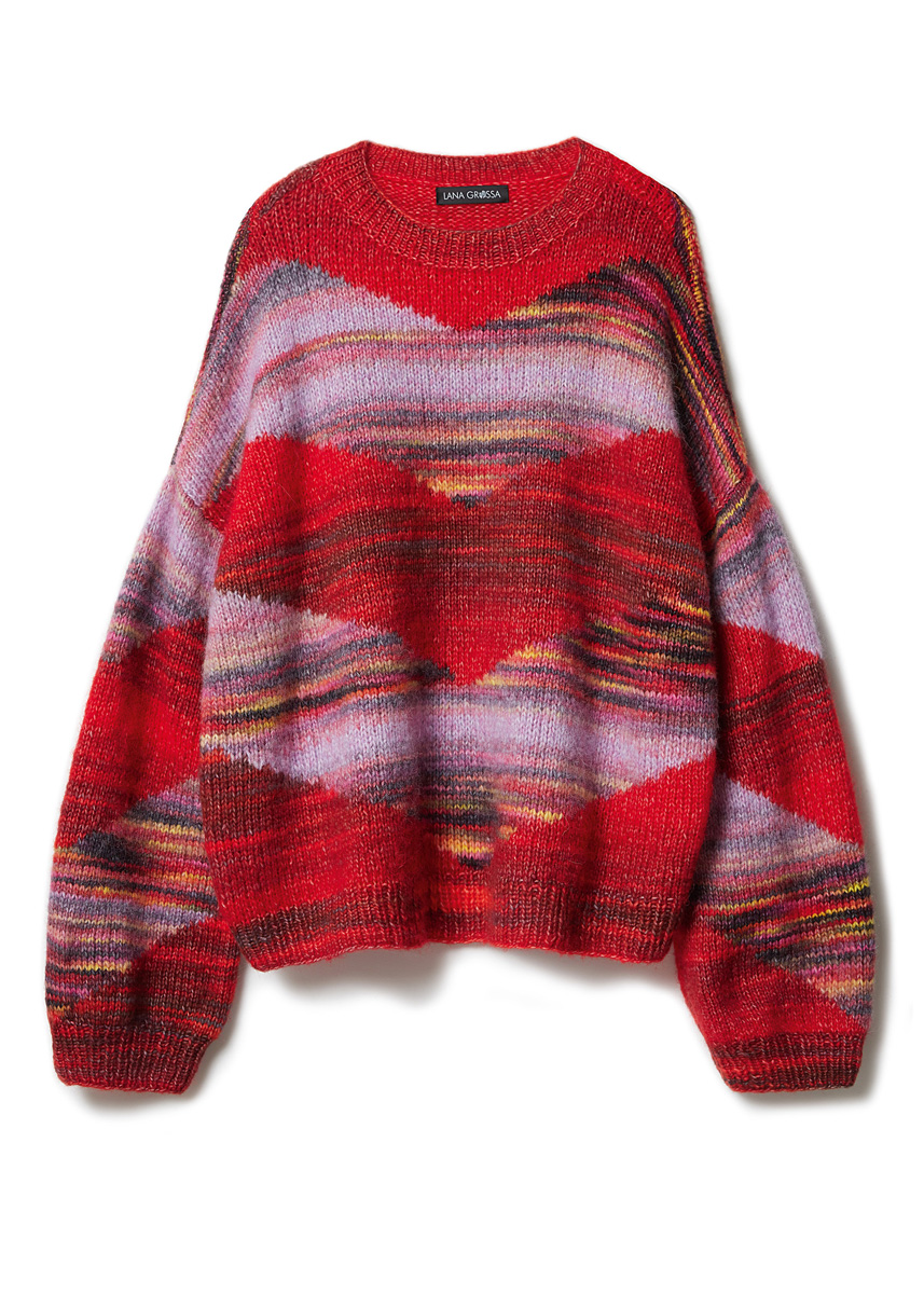 Lana Grossa-kvalitet „Picasso“ (36% ren ny ull (merino extrafin), 36 % alpacka (baby), 28 % polyamid, löplängd = ca 210 m/50 g): ca 200 (200 - 250 - 250) g Vinröd/körsbärsröd/ eldröd/brunröd/nougat (färg 12) = Färg A och ca 150 (150 - 200 - 200) g hallon/lax/gråbrun/beige/grålila/syren/taupe (färg 9) = Färg B; stickor nr. 5 och 5,5; 1 kort rundsticka nr. 5