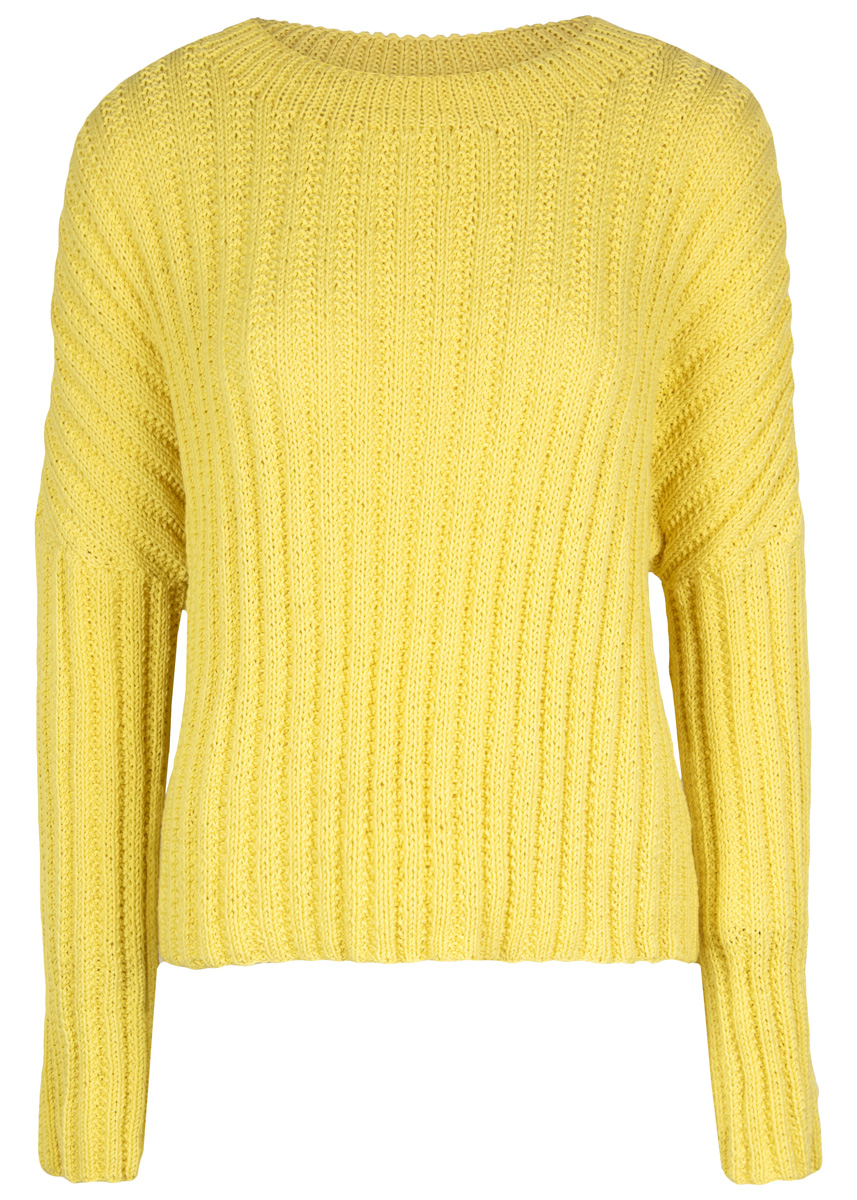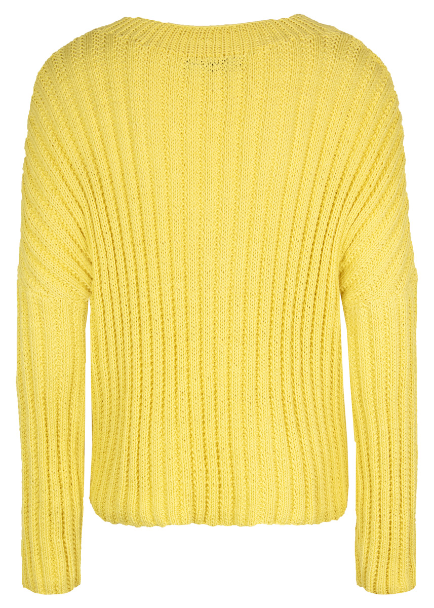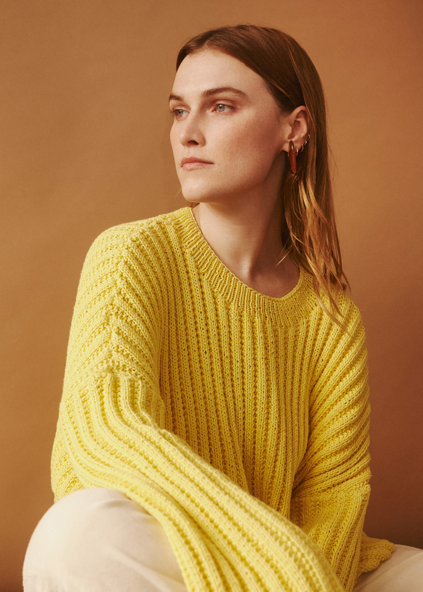Lana Grossa „Pima“ (100% Pima bomull; löplängd 125 m/50 g), 600 (650/700) g i gul (färg 11); stickor nr. 3, 1 rundsticka nr. 3 i 40 cm längd.