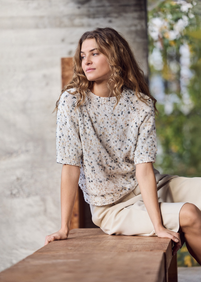 Lana Grossa-kvalitet „Popcorn“ (100 % bomull, løpelengde = ca 125 m/50 g): ca 300 (350 - 400 - 450) g hvit/beige/kamel/grå/anthrasitt (farge 9); kort og lange rundpinne nr. 4,5 og nr. 5; strømpepinner nr. 4,5 og nr. 5; maskemarkører. Genseren strikkes ovenfra og ned i ett stykke.