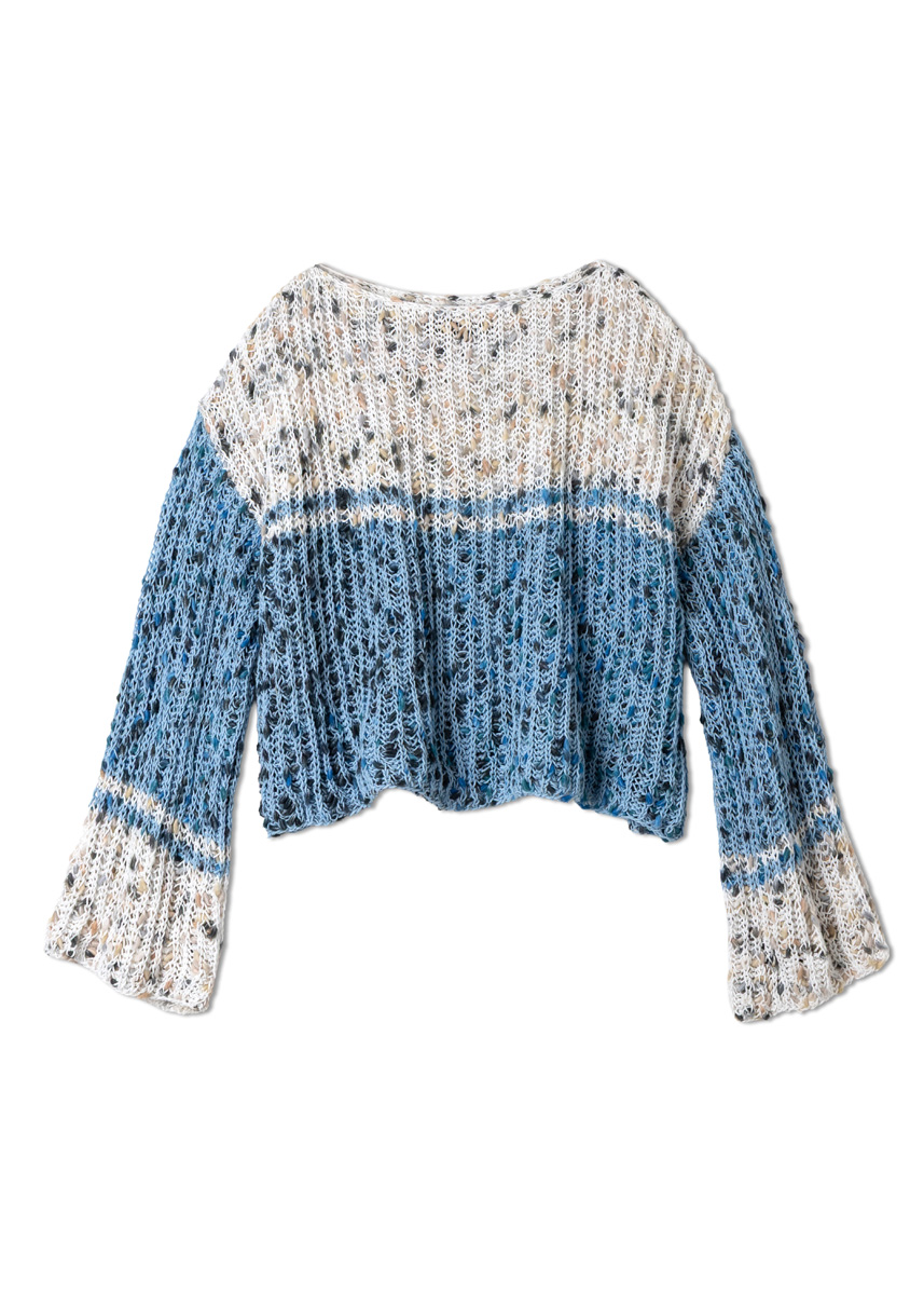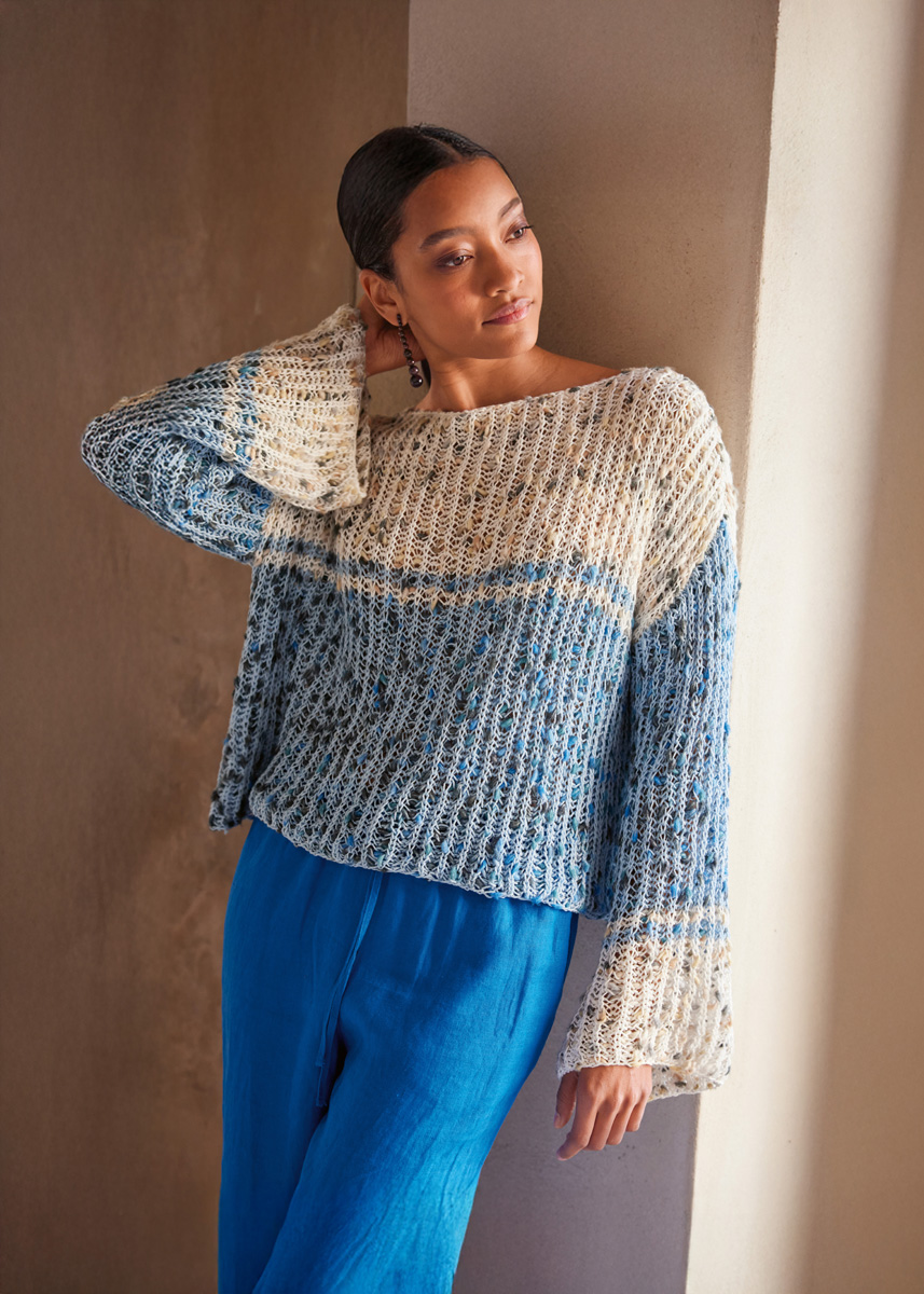 Lana Grossa Popcorn (100% bomull, løpelengde = ca 125 m/50 g), 300 (300 - 350 - 350) g i lysblå/petrol/grafitt (farge 6) og 200 (250 - 300 - 300) g i hvit/beige/kamel/grå/ antrasitt (farge 9). strikkepinner nr. 7. 1 heklenål nr. 6