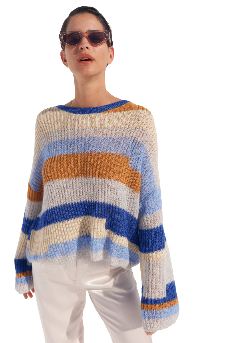 Lana Grossa-kvalitet „Puno Luce“ (30 % (baby) alpacka, 30 % ren ny ull (merino), 20 % polyamid, 20 % bomull, löplängd = ca. 250 m/50 g): ca. 100 (100 - 100) g var i ljusbeige (färg 16), guldbrun (färg 13) och blå (färg 10) och Lana Grossa-kvalitet „Bella“ (35 % bomull, 30 % nylon, 25 % (baby) alpacka, 10 % ren ny ull (merino), löplängd = ca. 250 m/25 g): ca. 25 (50 - 50) g i ljusgrå (färg 14) och 50 (50 - 50) g i blå (färg 11); stickor nr. 3,5, 1 rundsticka nr. 3,5, 40 cm lång.