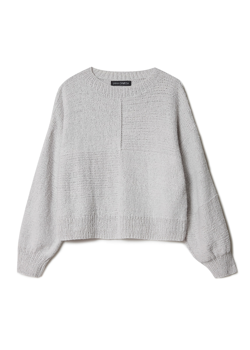 Lana Grossa-kvalitet „Riccio“ (84 % bomull, 16 % polyamid, löplängd = ca 110 m/50 g): ca 400 (450 - 500 - 550) g lysande grå (färg 2); stickor nr 3,5 och nr 4,5; 1 kort rundsticka nr 3,5.