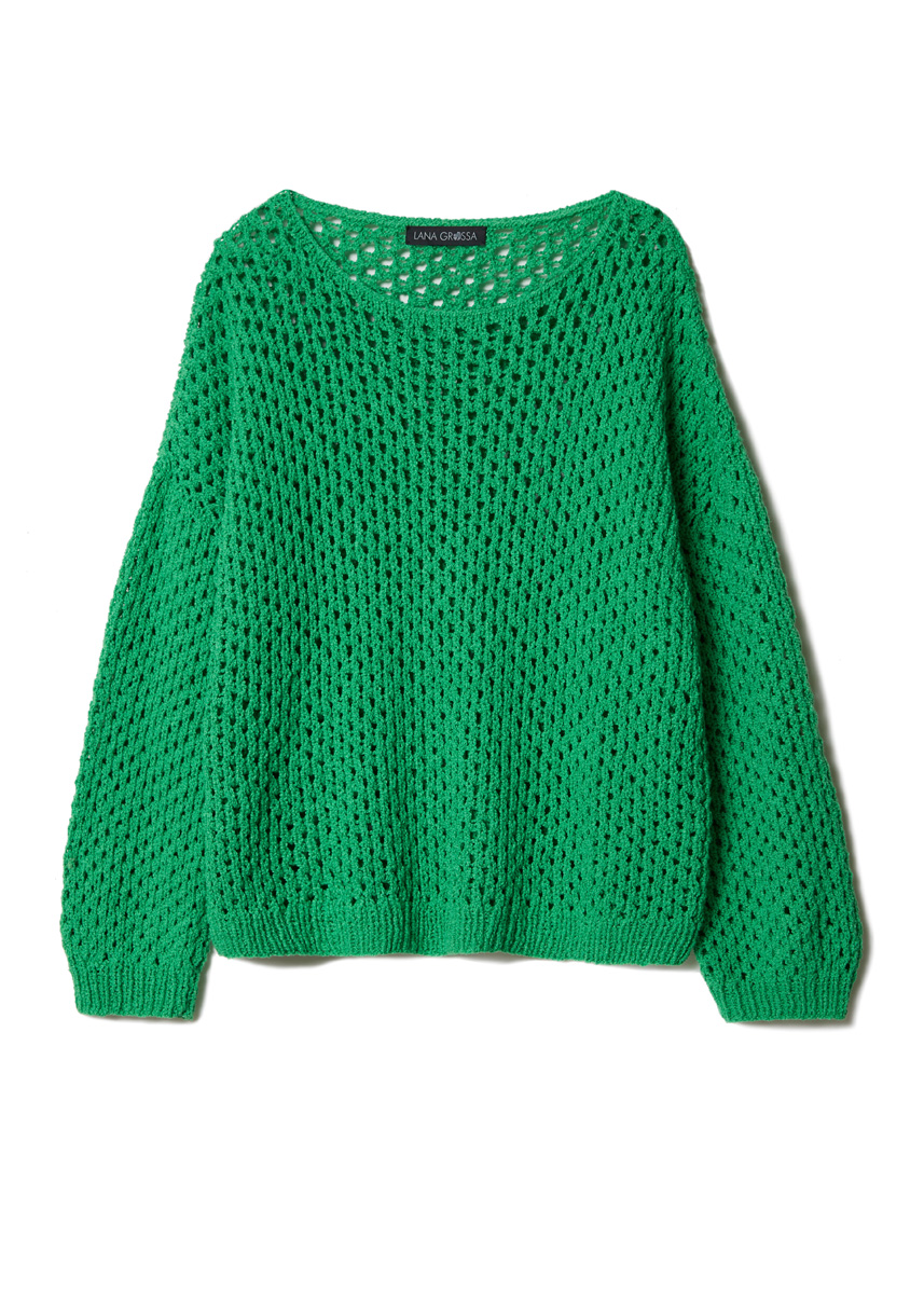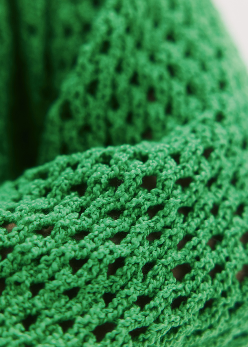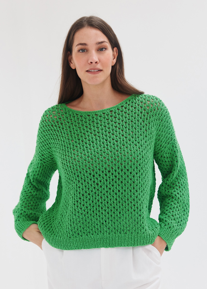 Lana Grossa-kvalitet „Riccio“ (84 % bomull, 16 % polyamid, löplängd = ca 110 m/50 g): ca 400 (400 - 450 - 500 - 550) g majgrön (färg 16); stickor nr 5 och nr 5,5; 1 kort rundsticka nr 5.