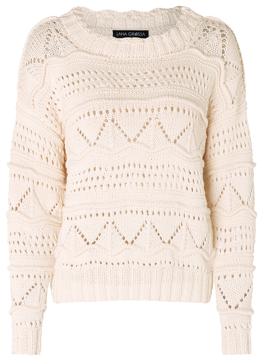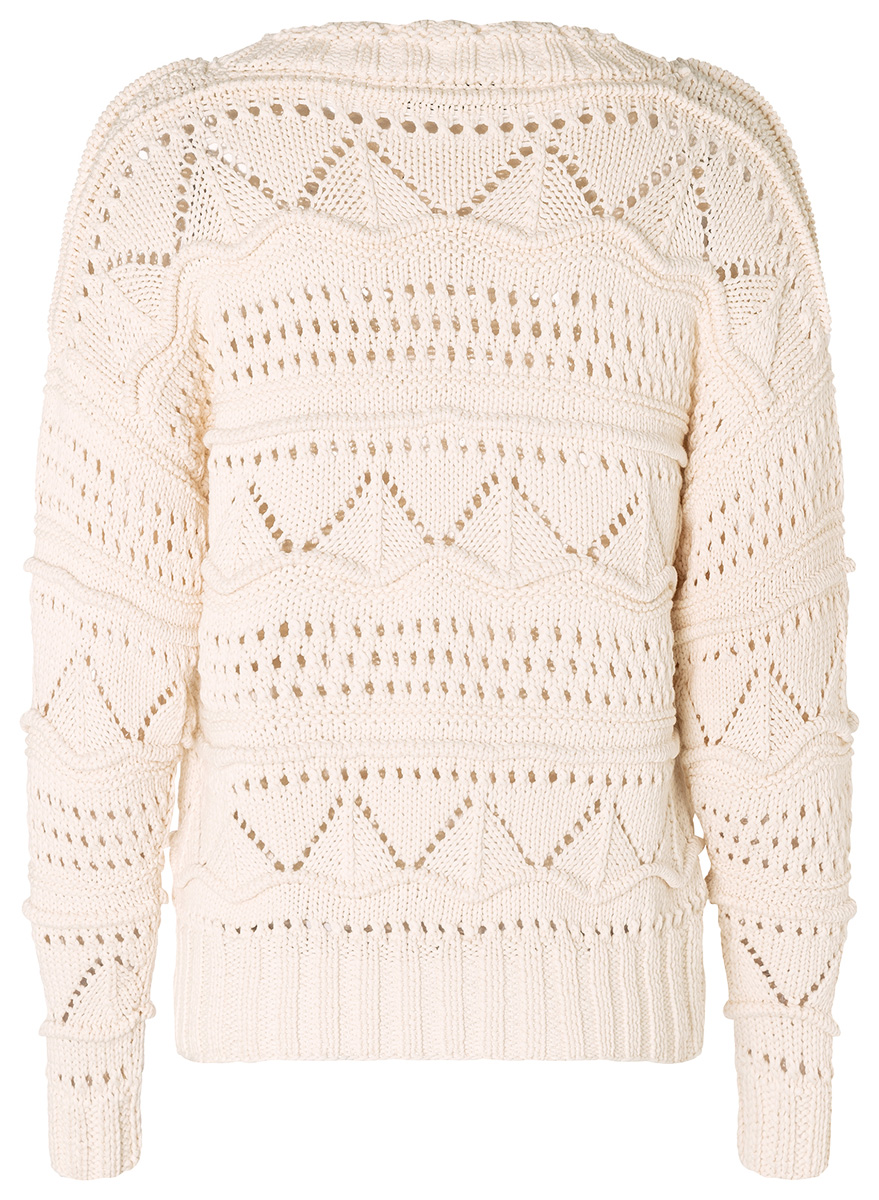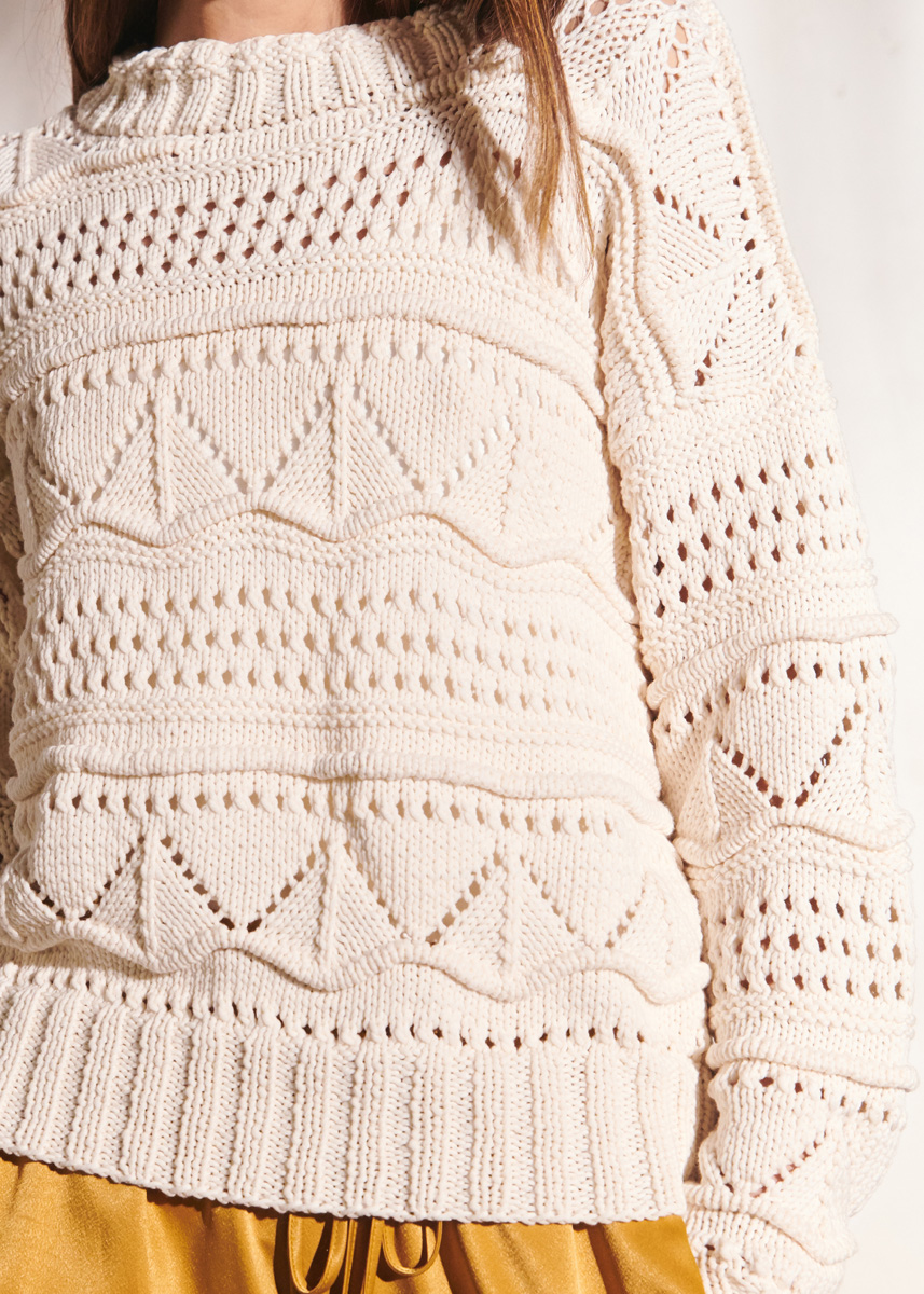 Lana Grossa-kvalitet „Riserva” (70 % (bio) bomull, 30 % återvunnen polyamid, löplängd = ca. 125 m/50 g): ca. 500 (550) g ecru (färg 2); stickor nr. 5,5 och 6,5, 1 rundsticka nr. 5,5, 50 cm lång, 1 ullvirknål nr. 4.