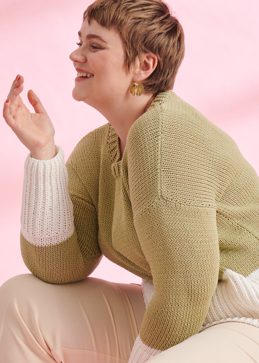 Lana Grossa-kvalitet „Riserva“ (70 % (bio) bomull, 30 % återvunnen polyamid, löplängd 125 m/50 g): ca. 300 (350 – 400) g vassgrön (färg 19) och ca. 250 (250 –300) g vit (färg 1); stickor nr. 5,5 och 6,5, 1 rundsticka nr. 5,5, 50 cm lång.