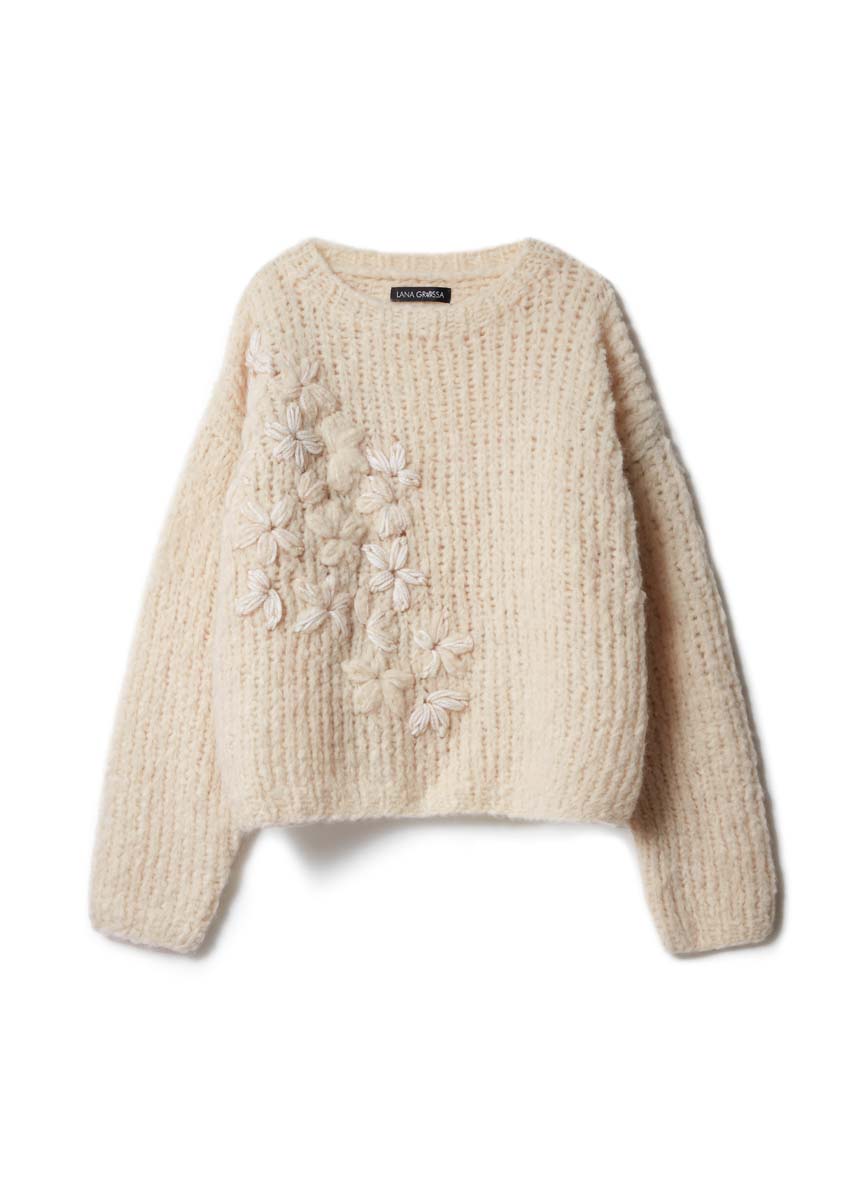 Lana Grossa-kvalitet „Royal Alpaca” (93 % alpacka (royal), 7 % polyamid, löplängd = ca. 95 m/50 g): ca. 300 (350) g ljusbeige (färg 2) och Lana Grossa-kvalitet „Twinny” (97 % ren ny ull (extrafin merino), 3 % polyamid, löplängd = ca. 100 m/50 g): ca. 50 g ljus-/Sandbeige (färg 1); stickor nr. 9 och 10, 1 rundsticka nr. 9, 40 cm lång, 1 ullnål från Lana Grossa till broderingen.