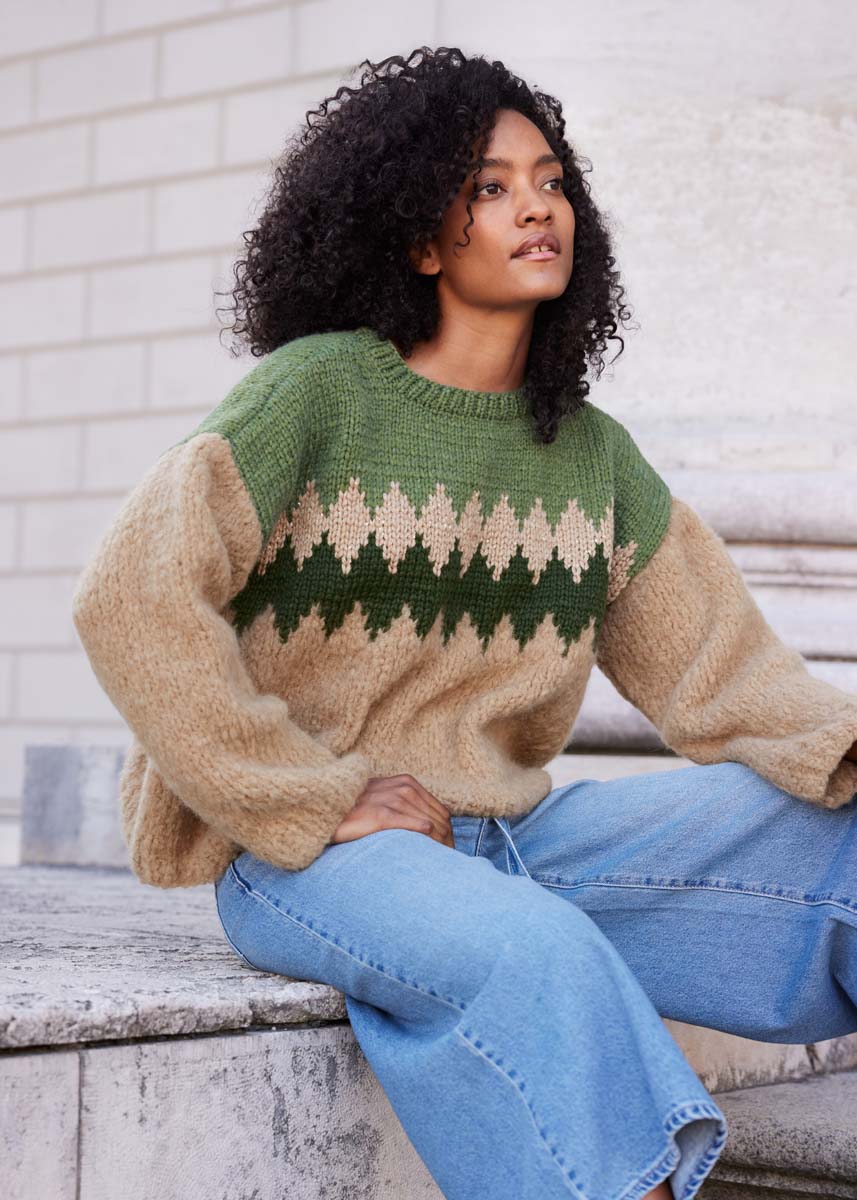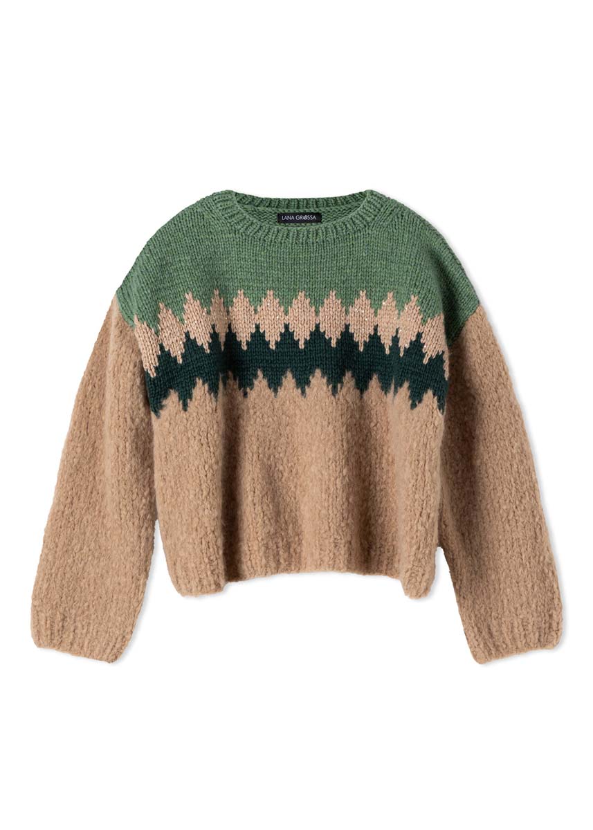 Lana Grossa Royal Alpaca (93% Alpaca (Royal), 7% polyamid, løpelengde = ca. 95 m/50 g), 250 (300 - 350) g i beige (farge 11) og Lana Grossa Winter Softness (62% ny ull (merino ekstrafin), 38% bomull, løpelengde = ca. 70 m/50 g) 150 (150 - 200) g i skoggrønn (farge 4), 100 g i mørkgrønn (farge 5), 50 g i beige (farge 18) og Lana Grossa Glamour (55% polyamid, 45% polyester, løpelengde = ca. 112 m/25 g), 25 g i beige (farge 10); strikkepinner nr. 7 og en 50 cm lang rundpinne nr. 6.