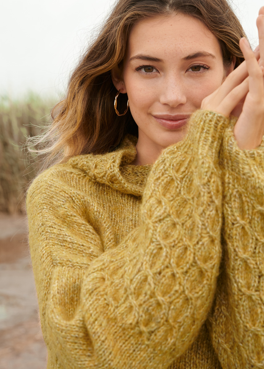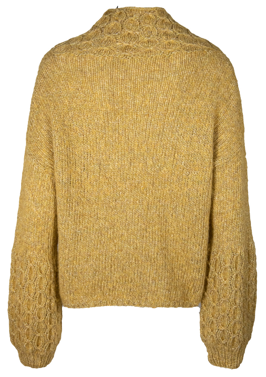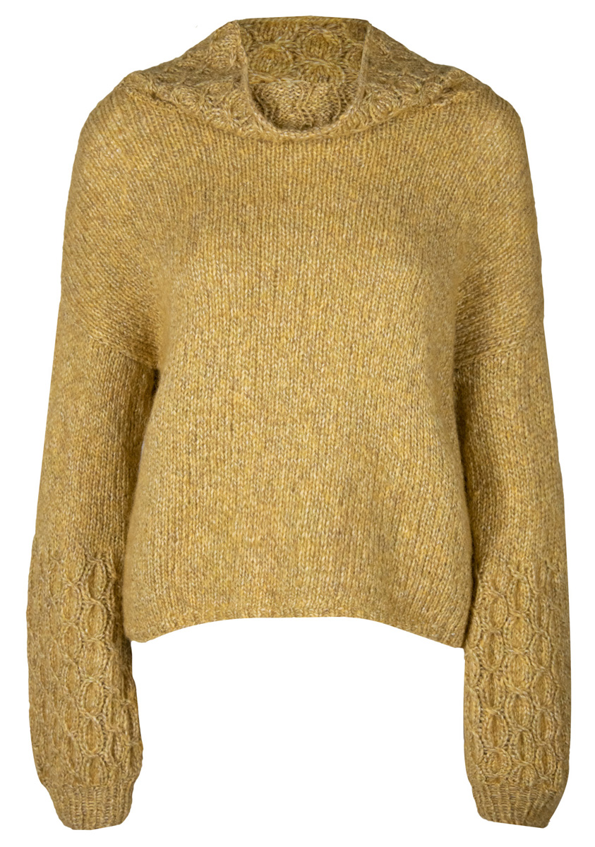 Lana Grossa-kvalitet „Sara” (65 % bomull, 30 % (baby) alpacka, 5 % ren ny ull (merino), löplängd = ca. 125 m/50 g): ca. 400 (450) g gul melerad (färg 13); stickor nr. 5 och 5,5, 1 rundsticka nr. 5,5, 50 cm lång, 2 flätstickor [= hjälpstickor].