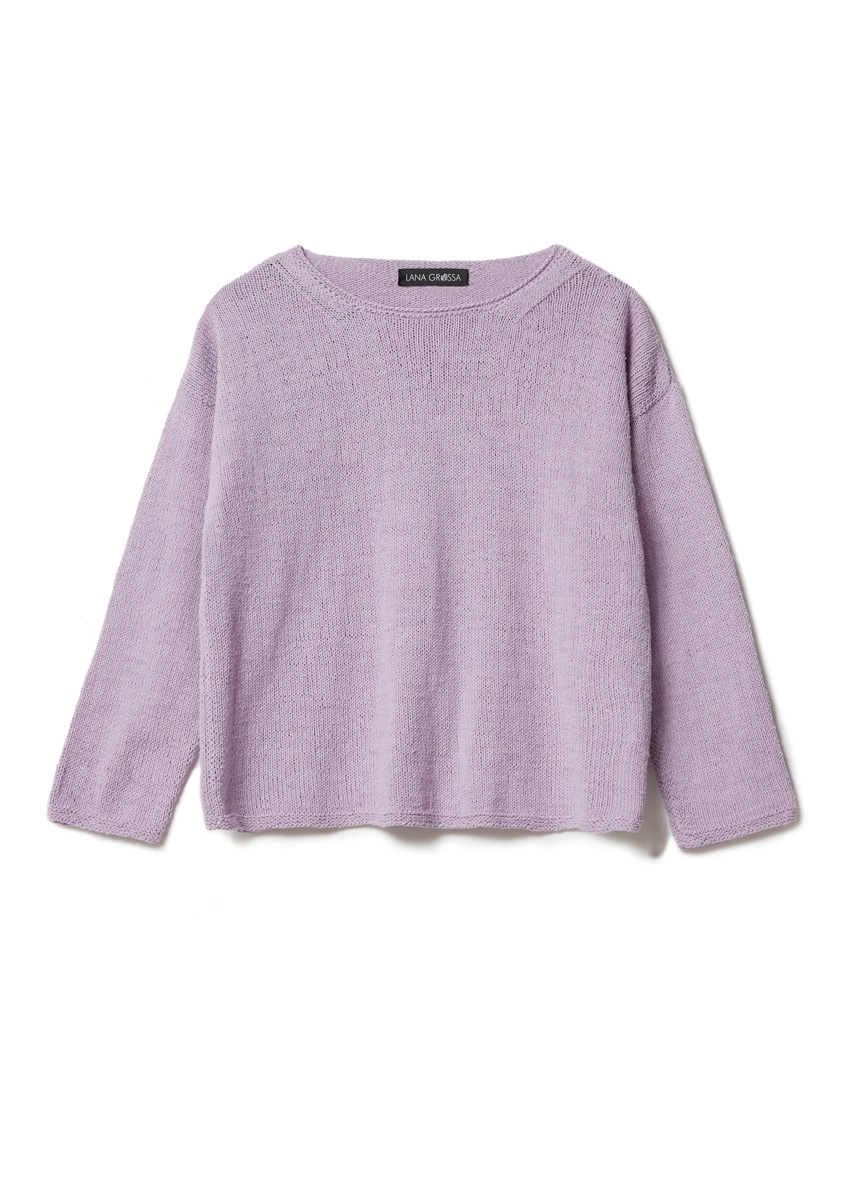 Lana Grossa „Setapura“ (100 % silke, löplängd 200 m/50 g), 300 (300 – 350 – 400) g syrenlila (färg 6); stickor nr. 3, rundsticka nr. 3, 40 cm lång; alternativ strumpstickor nr. 3.