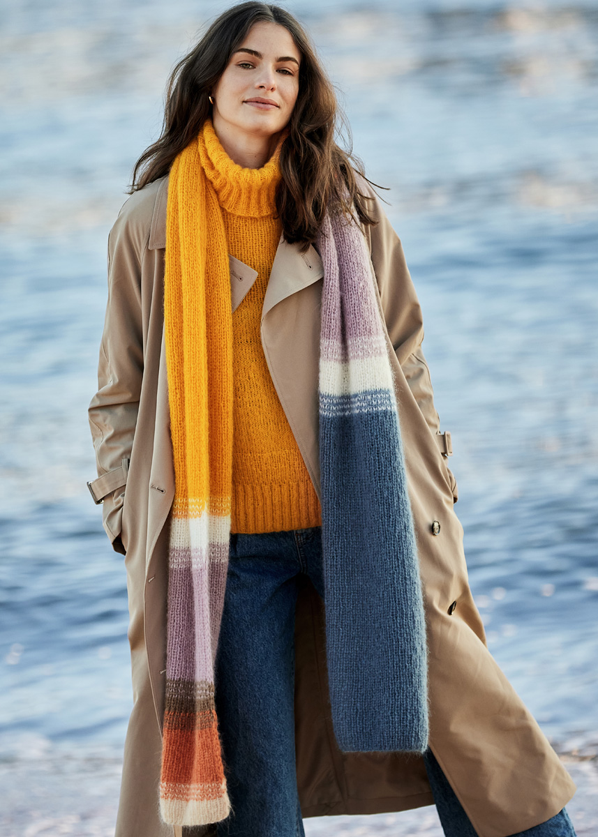 Lana Grossa-kvalitet „Setasuri Big“ (70 % alpacka (Suri), 20 % silke, 10 % ren ny ull (merino), löplängd = ca 100 m/25 g): ca 275 (300 - 300 - 325) g ägggulegul (färg 509); stickor nr. 3,5 och 4; 1 kort rundsticka nr. 4.