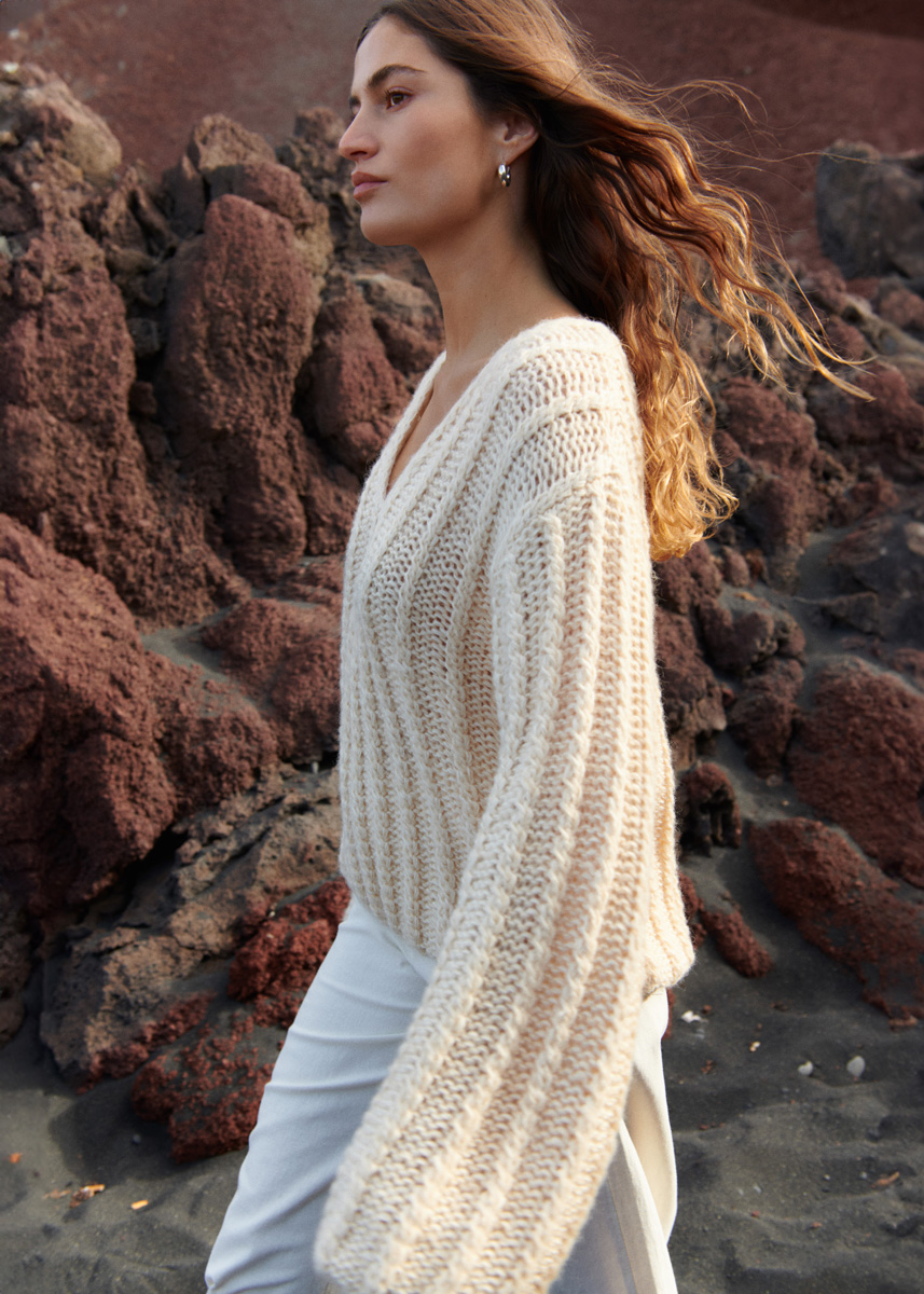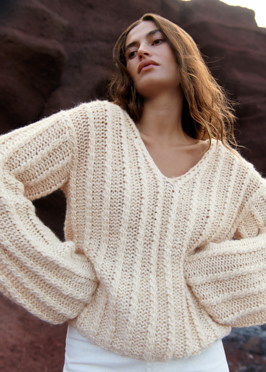 Lana Grossa „Setasuri“ (69 % alpacka (suri), 31 % silke, löplängd 212 m/25 g), 175 (225) g ljusbeige (färg 58), Lana Grossa „Ecopuno“ (72 % bomull, 17 % ren ny ull (merino), 11 % alpacka (baby), löplängd 215 m/50 g), 400 (450) g écru (färg 46); stickor nr. 7 och 8. Tips: Hela pullovern stickas med 4-trådigt med 2 trådar Ecopuno och 2 trådar Setasuri.