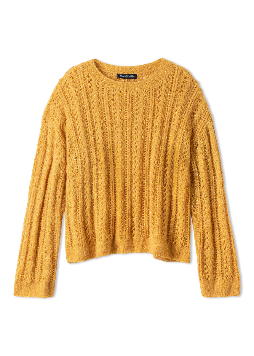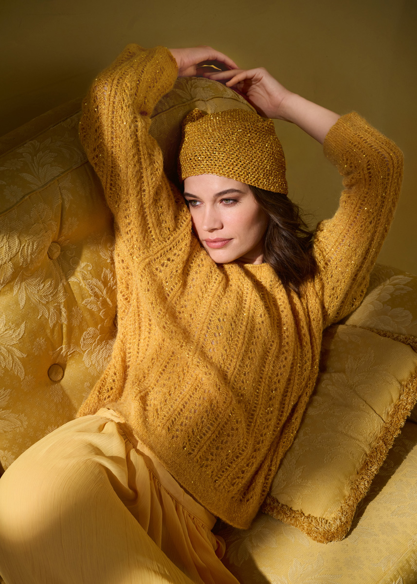 Garn: Lana Grossa «Setasuri» (69 % alpakka (suri), 31 % silke, LL = ca. 212 m/25 g): Ca. 150 (200) g eggeplommegul (frg 70); Lana Grossa «Glamour» (55 % polyamid, 45 % polyester, LL = ca. 115 m/25 g): Ca. 250 (350) g gullgul (frg 18) Pinner: Nr. 3 og nr. 3,5, kort rundpinne nr. 3. Genseren blir strikket med dobbel tråd, en tråd av hver kvalitet.