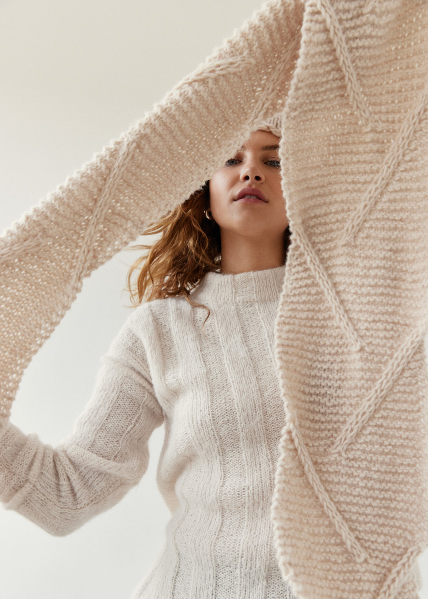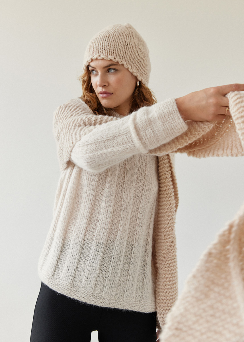 Lana Grossa Setasuri (69% alpacka (Suri), 31% silke, löplängd 212 m/25 g), 275 (300 – 325) g Creme (färg 2); stickor nr. 4 och 4,5 och 1 rundsticka nr. 4, 40 cm lång. Obs: Modellen stickas med dubbla trådar!