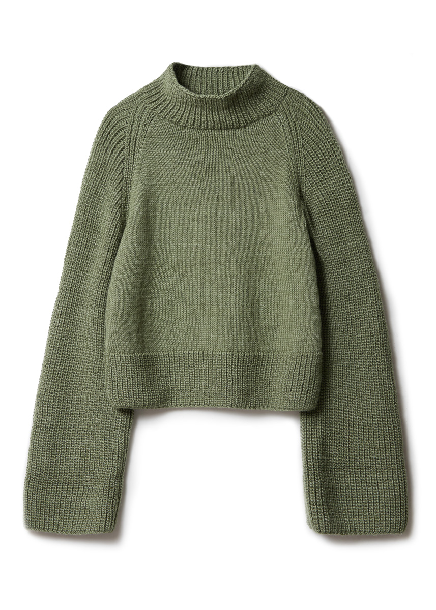 Lana Grossa Setosa (65% ren ny ull (Merino superfein), 35% silke, löplängd 150 m/50 g), 600 (650 – 700) oliv (färg 17); stickor nr. 4 och 5, samt 1 rundsticka nr. 4, 40 cm lång.