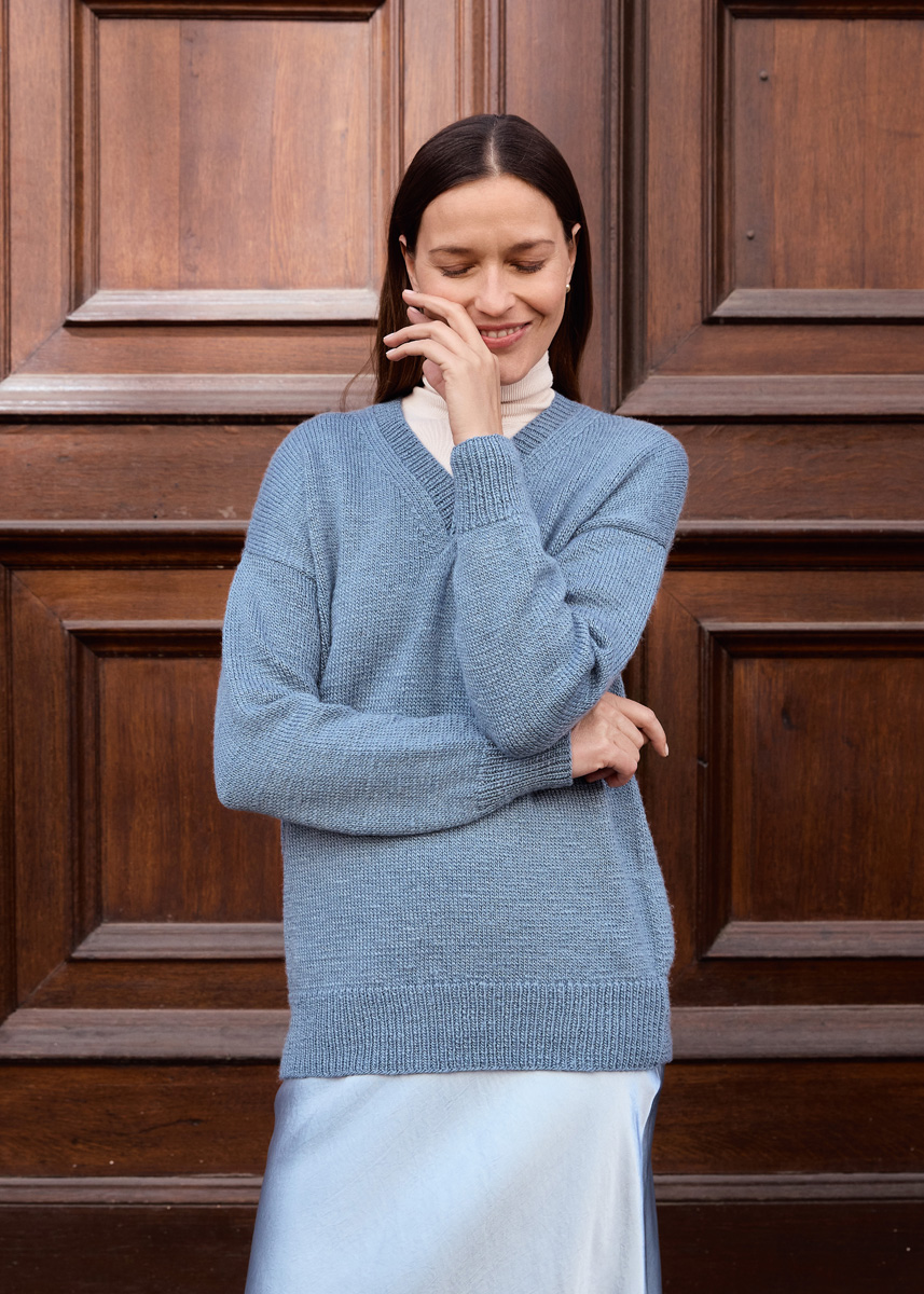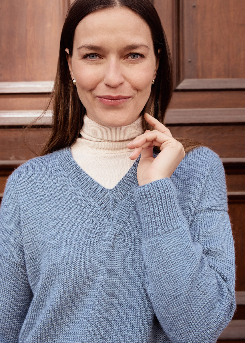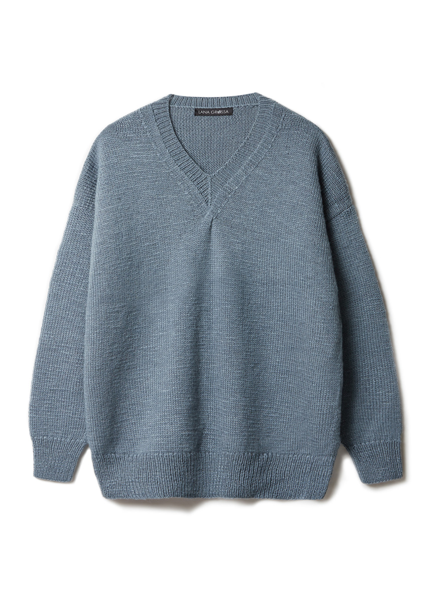 Lana Grossa Setosa (65% ren ny ull (Merino superfein), 35% silke, löplängd 150 m/50 g), 500 (550 – 600) g gröngrå (färg 15); stickor nr. 3,5 och 4, samt 1 rundsticka nr. 3,5, 40 cm lång och 1 flätsticka.