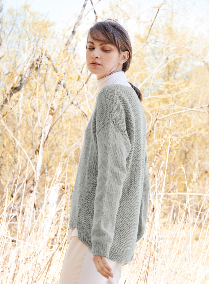 Seventyfive är ett garn av hög kvalitet laget av återvunnen kashmir och merinoull. Den klassiske kashmirkänslan kommer först helt när du har tvättat ditt plagg. På grund av den speciella konstruktionen och den extrema mjukheten, ökar storleken med ca 5-10% efter den första tvätten. Så om du föredrar en slim fit, arb fastare eller använd tunnare stockor. Men om du föredrar det presenterade överdimensionerade utseendet, blir plagget lite mer avslappnat.