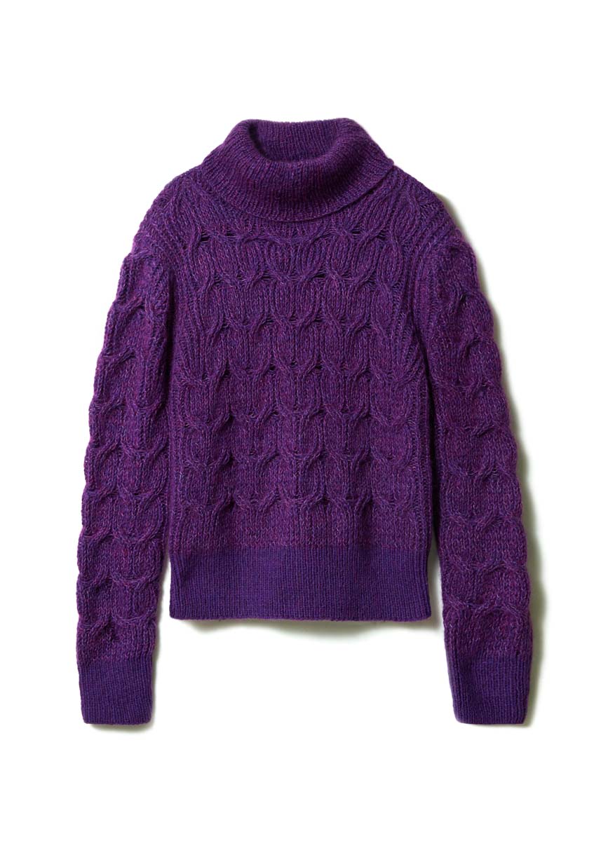 Lana Grossa-kvalitet „Silkhair” (70 % mohair (superkid), 30 % silke, löplängd = ca. 210 m/25 g): ca. 150 (175) g aubergine (färg 206) och Lana Grossa-kvalitet „Ecopuno” (72 % bomull, 17 % ren ny ull (merino), 11 % (baby) alpacka, löplängd = ca. 215 m/50 g): ca. 450 (500) g violett (färg 206); stickor nr. 3 och 6, rundstickor nr. 4 och 4,5, 50 cm långa.