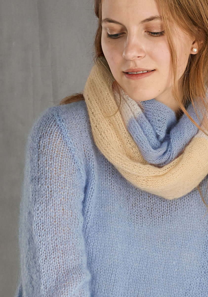 Lana Grossa Silkhair (70% Mohair, 30% Seide, Lauflänge 210 m/25 g), 200 (225 – 250) g Himmelblau (Fb 92); Stricknadeln Nr. 4,5 und 5, 1 Rundstricknadel Nr. 4,5, 40 cm lang.