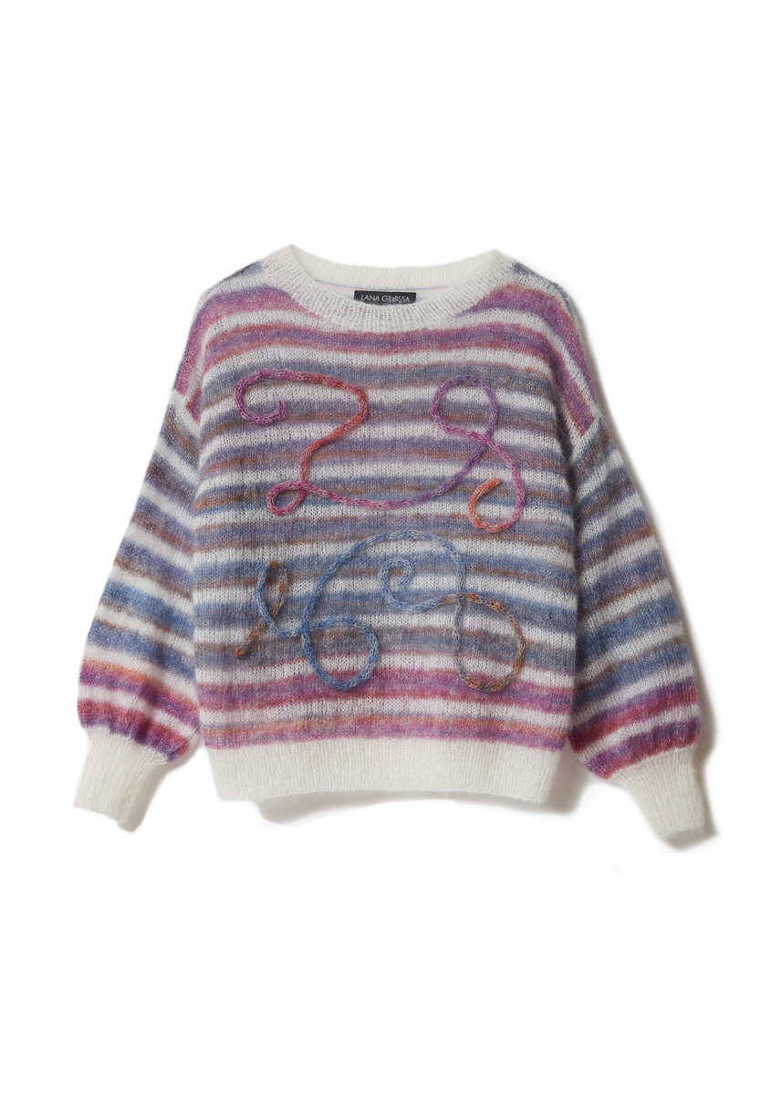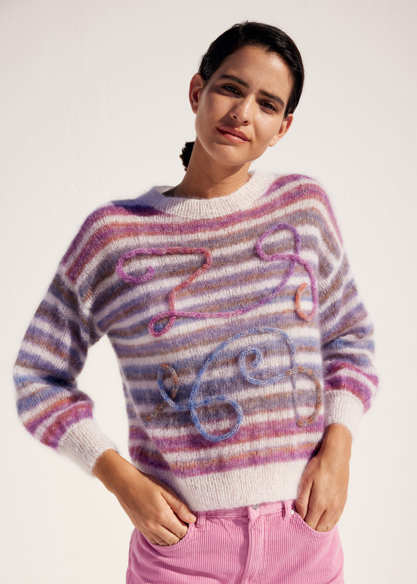Lana Grossa-kvalitet „Silkhair“ (70 % mohair (superkid), 30 % silke, löplängd = ca. 210 m/25 g): ca. 50 (75 - 75) g i vit (färg 117) och Lana Grossa-kvalitet „Silkhair Print“ (70 % mohair (superkid), 30 % silke, löplängd = ca. 210 m/25 g): ca. 75(100 - 100) g i jeans/silvergrå/rödviolett/rost/grå (färg 405); stickor nr. 3,5 och nr. 4, 1 rundsticka nr. 3,5, 50 cm lång, strumpstickor nr. 4.