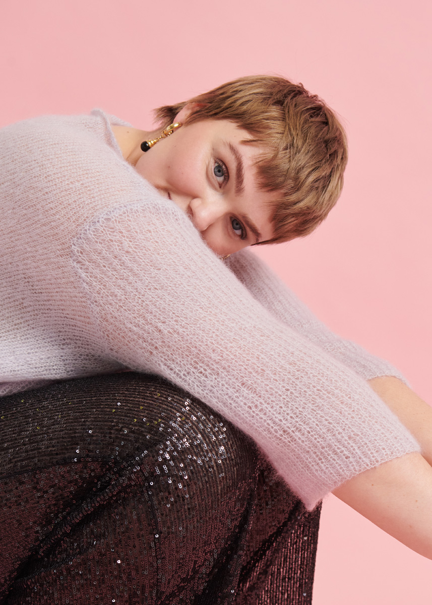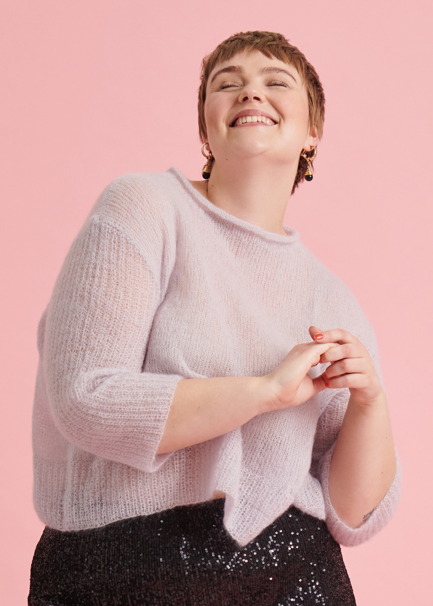 Lana Grossa-kvalitet „Silkhair“ (70 % mohair (superkid), 30 % silke, löplängd 210 m/25 g): ca. 175 (200 – 225) g grålila (färg 152); stickor nr. 3,5, 4 och 6, 1 rundsticka nr. 3,5, 50 cm lång.