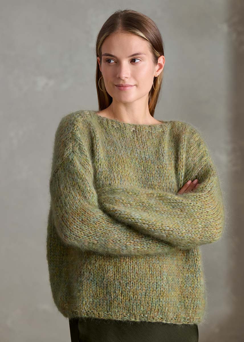 Lana Grossa „Silkhair“ (70% mohair (superkid), 30% silke, löplängd = ca. 210 m/25 g): ca. 75 (75 – 100) g grågrön (färg 105), ca. 75 (75 – 100) g vitgrön (färg 140), ca. 75 (75 – 100) g sjögrön (färg 155), ca. 75 (75 – 100) g nougat (färg 169), ca. 75 (75 – 100) g pistasch (färg 200); en rundsticka nr. 10, längd 80 cm