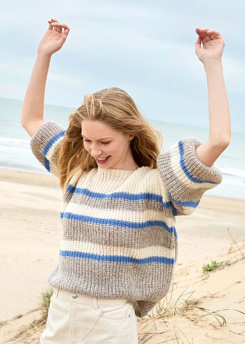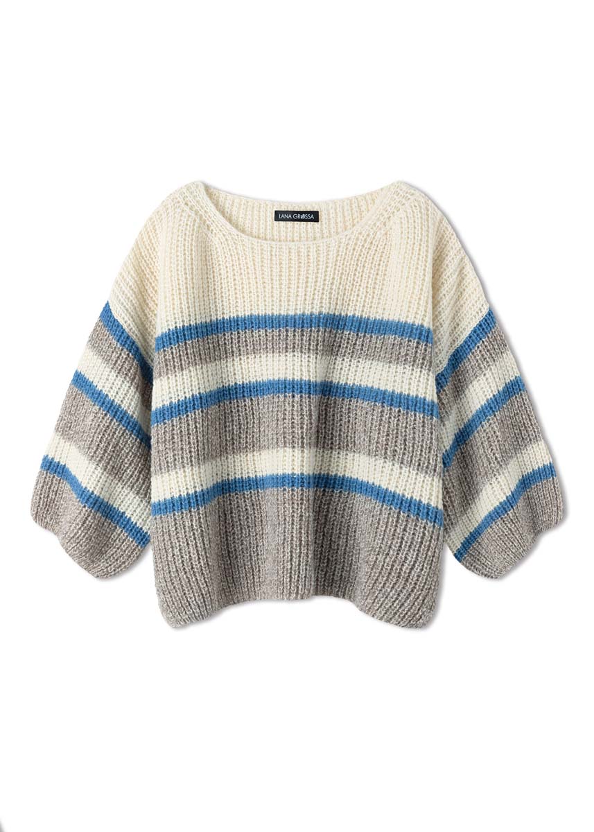 Garn: Lana Grossa «Soffio» (60 % ren ull (merino superfine), 30 % (bio) bomull, 10 % kashmir, LL = ca. 215 m/25 g): ca. 175 (200 – 225) g naturhvit (frg 18), ca. 100 (125 – 125) g taupe (frg 26) og ca. 75 (100 – 100) g himmelblå (frg 25)