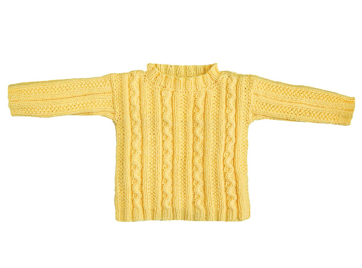 Lana Grossa-kvalitet ”Soft Cotton” (70 % bomuld, 30 % polyakryl, løbelængde = ca. 140 m / 50 gr.): 100(150-200) gr gul (fv 11), strikkepinde nr. 4, rundpind nr. 4, 40 cm.