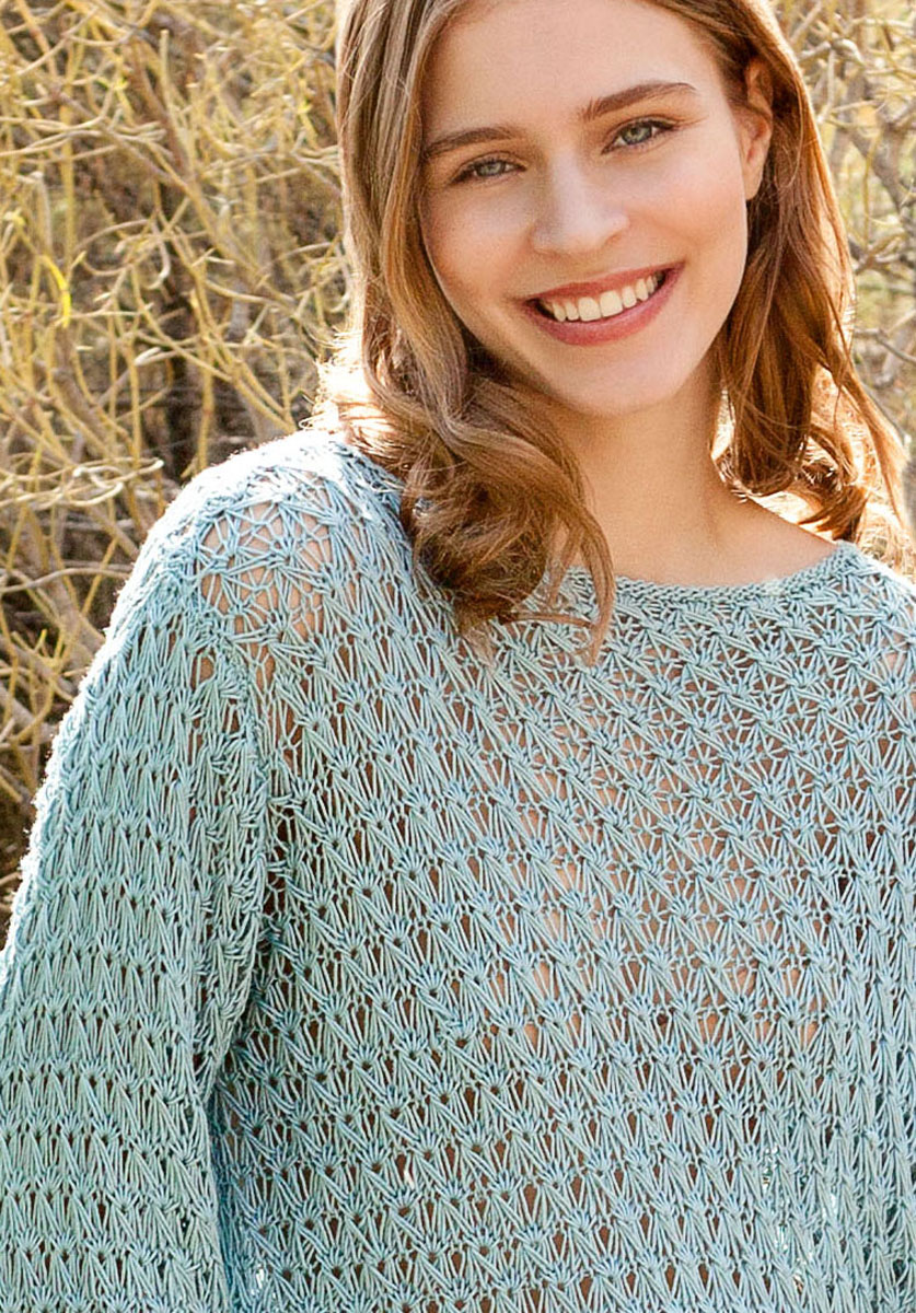 Lana Grossa-kvalitet ”Solo Lino” (80 % recycled hør (viskose), 20 % hør, løbelængde = ca. 105 m / 50 gr.): 300(350-400) gr turkisgrå (fv 22), strikkepinde nr. 4 og 4½, rundpind nr. 4, 40 cm