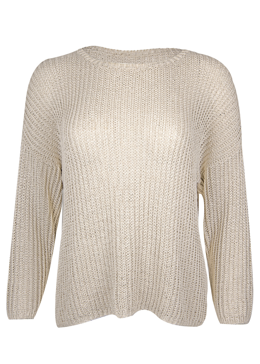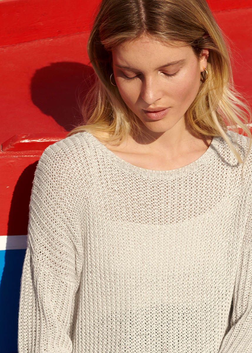 Lana Grossa-kvalitet „Solo Lino” (80 % återvunnen lin (viskos), 20 % lin, löplängd = ca. 120 m/50 g): ca. 550 (600 – 650) g grège (färg 2); stickor nr. 3 och 4, 1 rundsticka nr. 3, 50 cm lång, 1 ullnål från Lana Grossa.