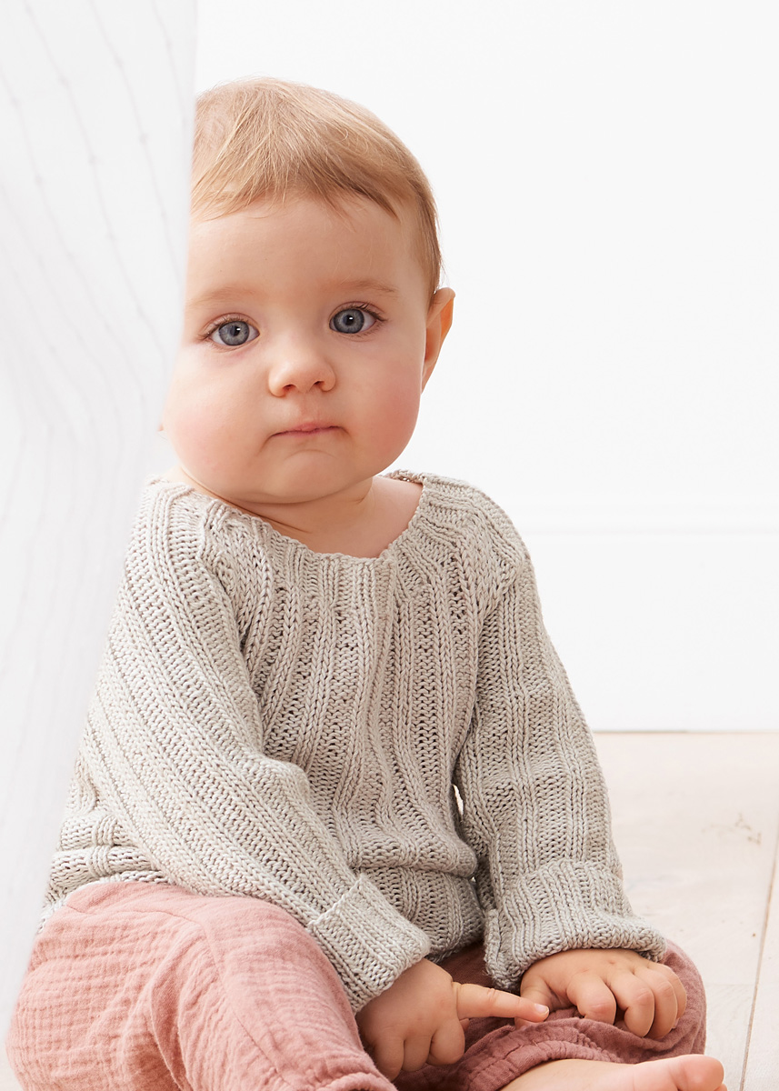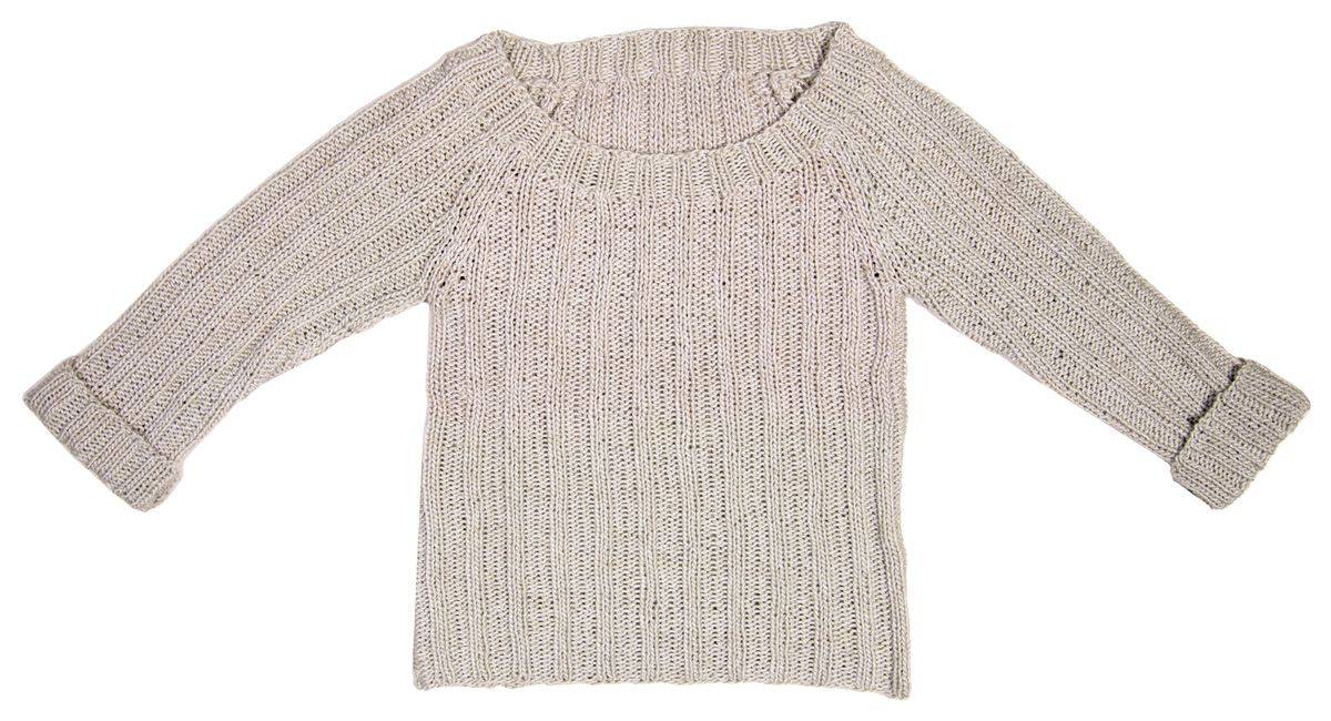 Lana Grossa-kvalitet ”Solo Lino” (100 % hør, løbelængde = ca. 120 m / 50 gr.): 150(200-250) gr grège (fv 2), strikkepinde nr. 3½, rundpind nr. 3½, 40 cm.