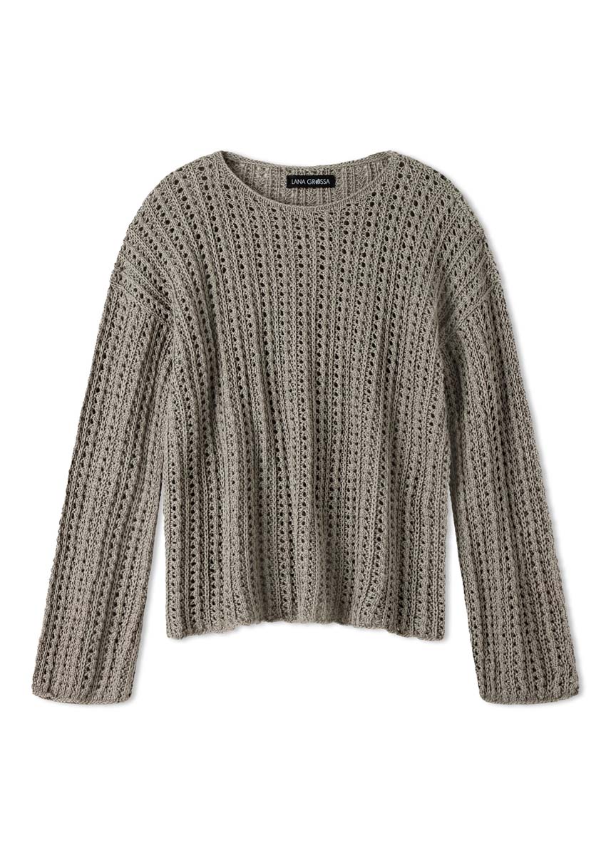Lana Grossa Summer Cashmere (90% bomull, 10% kasjmir, løpelenge 210 m/50 g), 350 (400 – 450) g kiselgrå (farge 8); pinner nr. 4 og 1 rundpinne nr. 3,5, 40 cm lang.