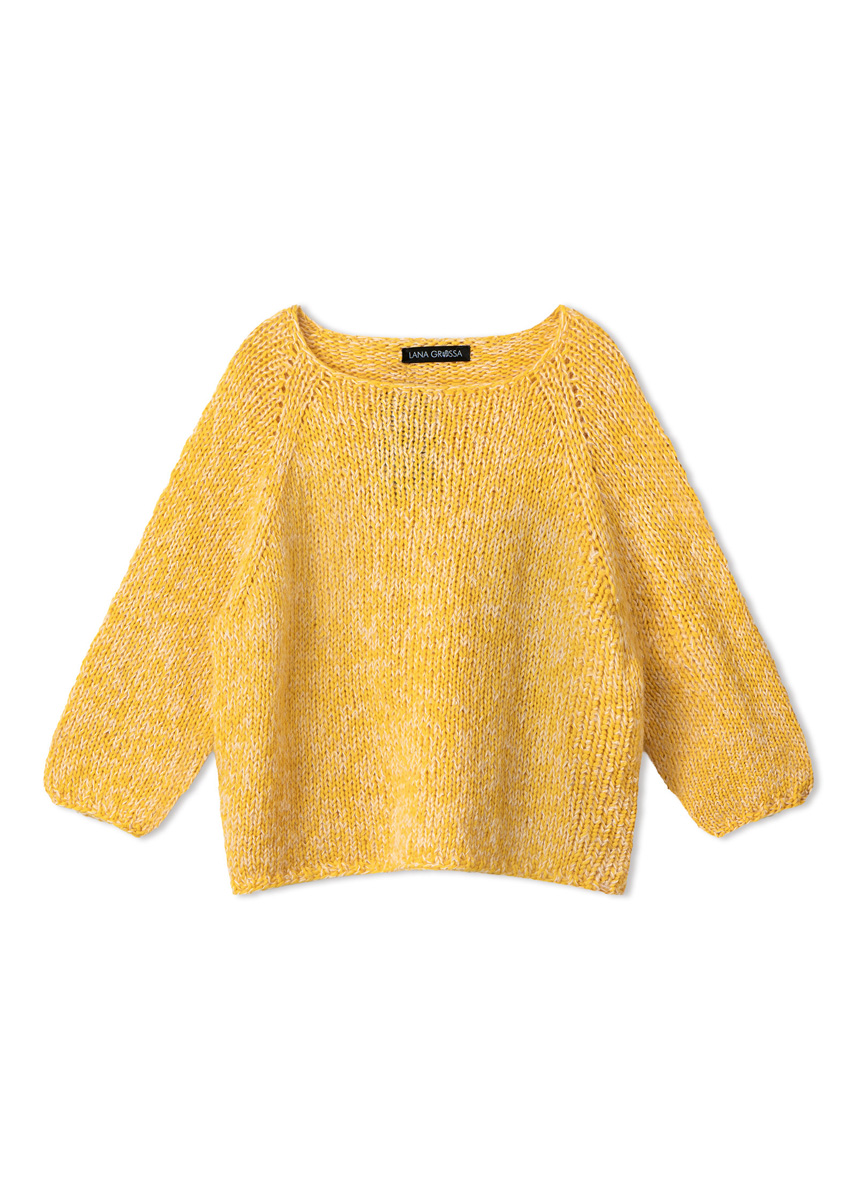 Material: Garn: Lana Grossa «Summer Softness» (80 % bomull (bio), 20 % ren ny ull (merino superfine), LL = ca. 130 m/50 g): Ca. 250 (300 - 350 - 400) g eggeplommegul (frg 21); Lana Grossa «Setasuri Pearls» (50 % alpakka (suri), 22 % silke, 16 % bomull, 12 % glass, LL = ca. 140 m/25 g): Ca. 75 (100 - 100 - 125) g lys beige (frg 201) Pinner: Kort og lang rundpinne nr. 7, maskemarkører