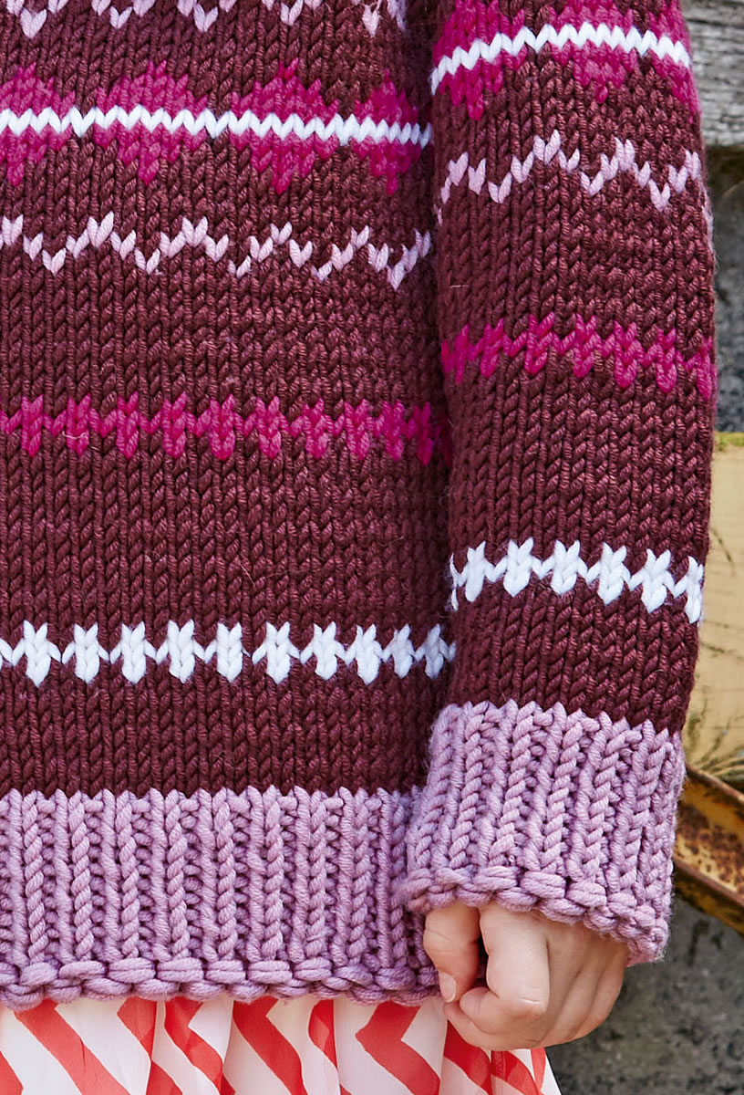 Lana Grossa Superbingo (100% Schurwolle, Lauflänge 55 m/50 g), Rosa Pullover: 250 (300) g Burgund (Fb 38), 150 (200) g Flieder (Fb 55), 100(150) g Zyklam (Fb 45) und 50 g Weiß (Fb 49). Blauer Pullover: 250 (300) g Petrolblau (Fb 7), 150 (200) g Graubraun (Fb 4), 100(150) g Perlgrau (Fb 53) und 50 g Hellblau (Fb 59); Stricknadeln Nr. 7 und 1 Rundstricknadel Nr. 5, 40 cm lang, 1 Wollsticknadel