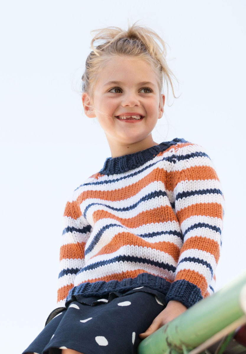 Lana Grossa Superbingo (100% Schurwolle, Lauflänge 55 m/50 g), 200 (250) g Weiß (Fb 49), 150 (200) g Orange (Fb 50) und 150 (200) g Royal (Fb 64); Stricknadeln Nr. 5,5 und 6, 1 Rundstricknadel Nr. 5,5, 40 cm lang.