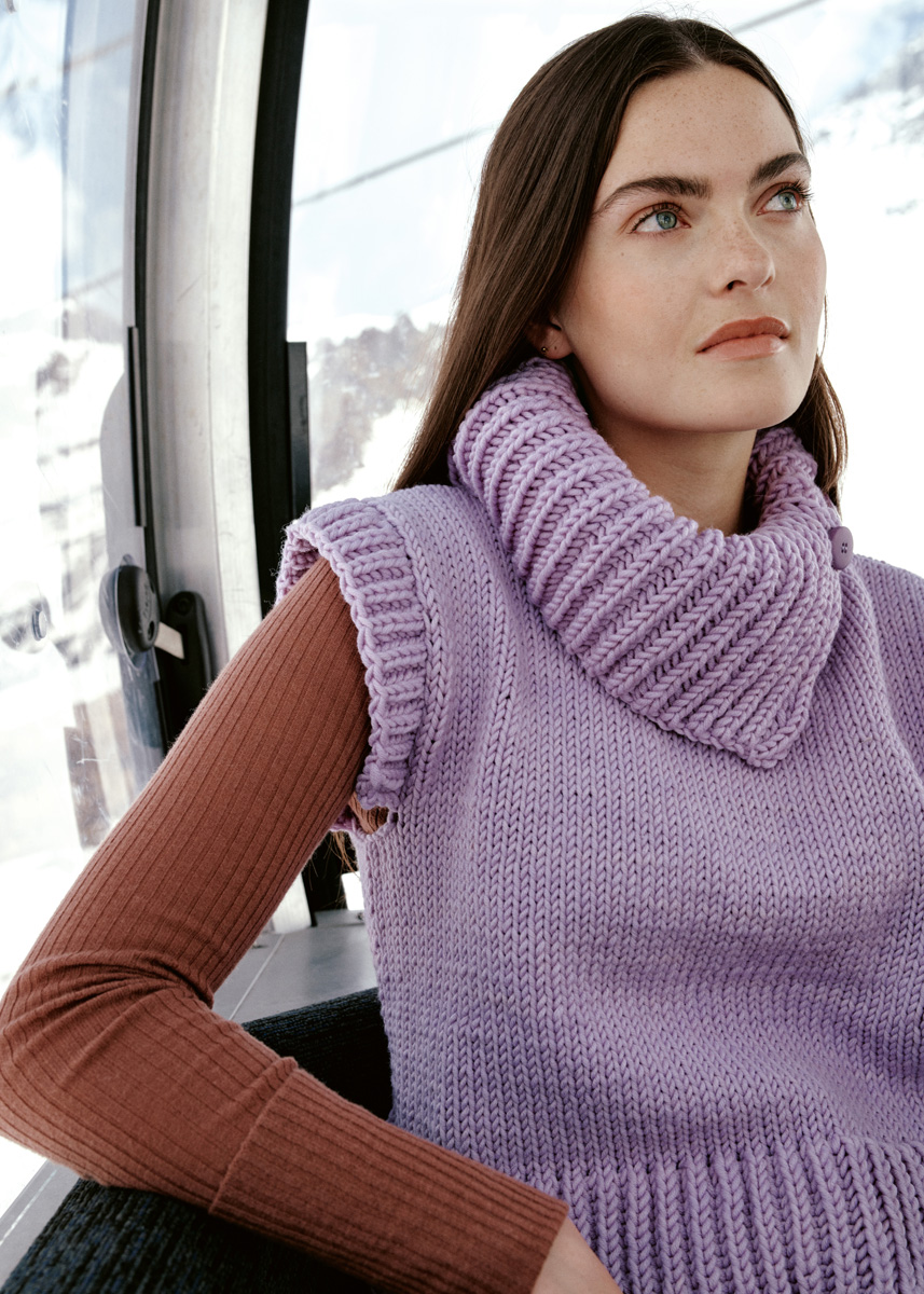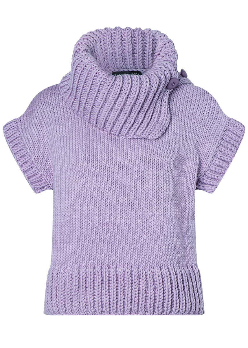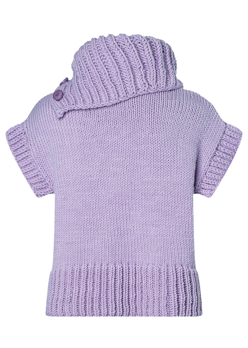 : Lana Grossa Superbingo (100% ren ny ull (merino), löplängd 55 m/50 g), 750 (800 – 850) g syren (färg 109); stickor nr. 7, rundstickor nr. 6 och 7, 40 cm långa, 3 knappar från UNION KNOPF, färg syren, storlek 25 mm.
