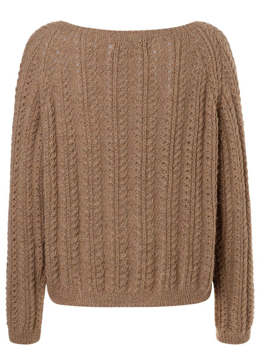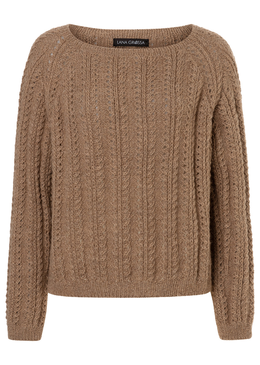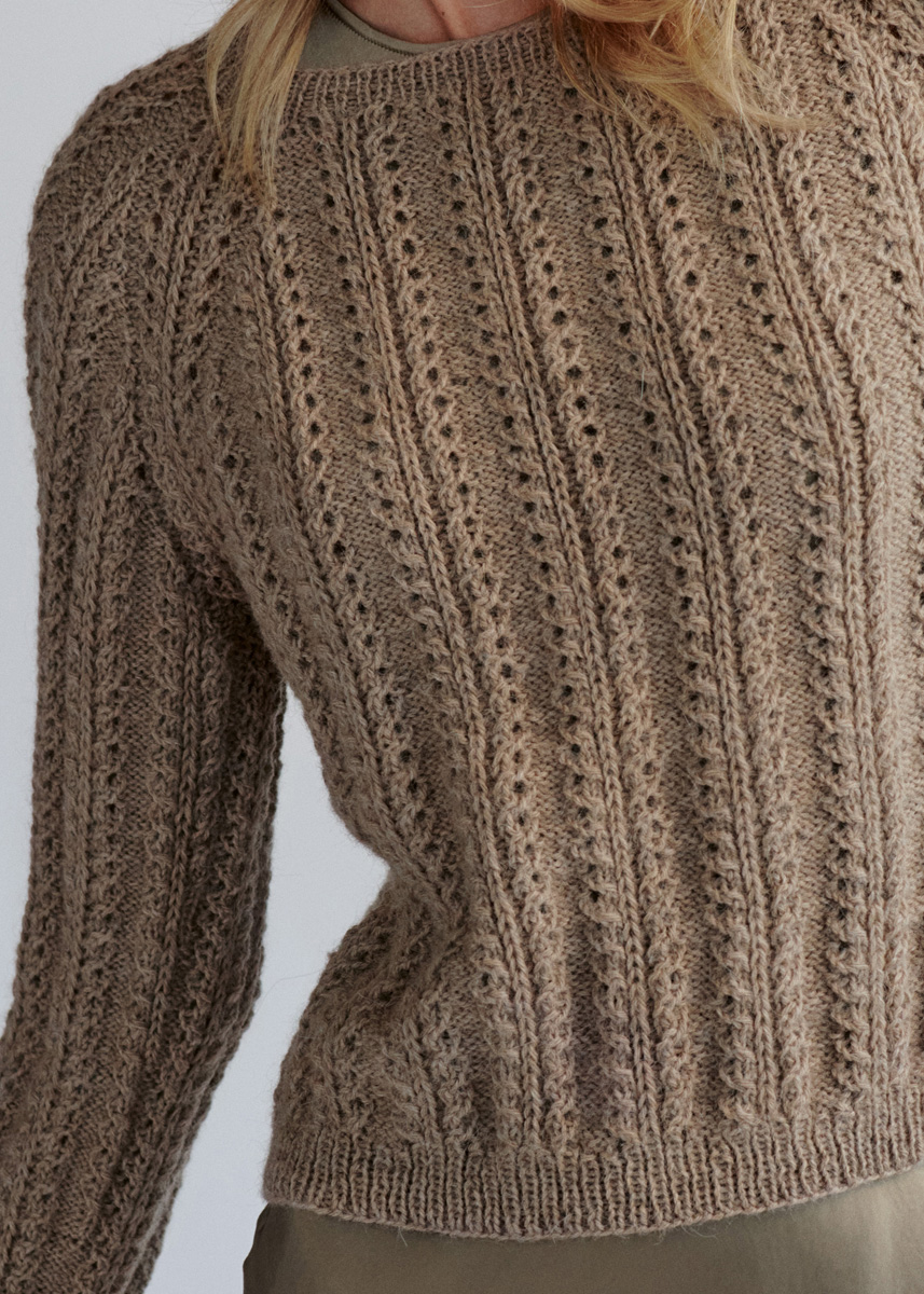 Lana Grossa-kvalitet „Natural Alpaca Classico” (85 % (baby) alpacka, 15 % ren ny ull (merino), löplängd = ca. 125 m/50 g): ca. 450 g kamel (färg 106); rundstickor nr. 3, 40 cm och 80 cm lång, rundstickor nr. 4, 40 cm, 60 cm och 80 cm lång, 4 maskmarkörer. Tips: Pullovern stickas runt utan söm uppifrån och ned.