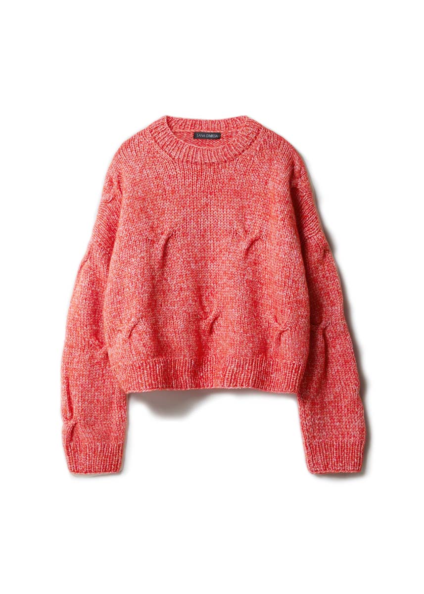 Lana Grossa-kvalitet „Twinny” (97 % ren ny ull (extrafin merino), 3 % polyamid, löplängd = ca. 100 m/50 g): ca. 450 (500 – 550) g rosa/hummer (färg 10); stickor nr. 6 och 7, 1 rundsticka nr. 6, 50 cm lång.