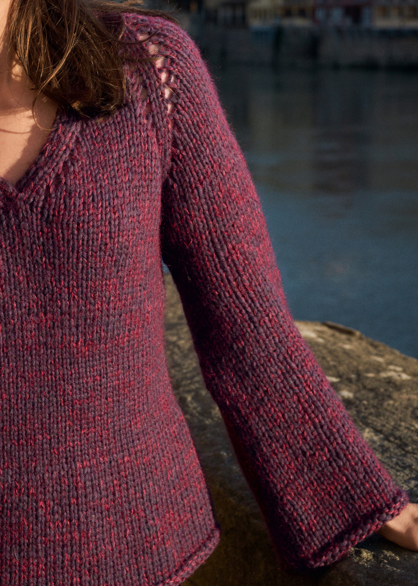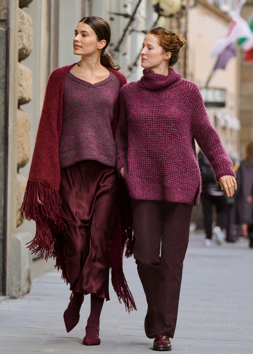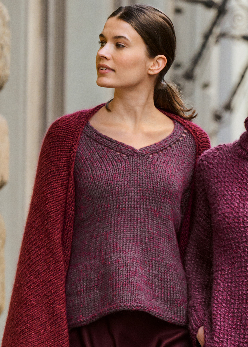 Garn: Lana Grossa «Winter Softness» (62 % ren ull (merino extrafine), 38 % bomull (bio), LL = ca. 70 m/50 g): Ca. 400 (450 - 500 - 550) g aubergine (frg 9), Lana Grossa «Silkhair» (70 % mohair (superkid), 30 % silke, LL = ca. 210 m/25 g): Ca. 75 (75 - 100 - 100) g bordeaux (frg 113).