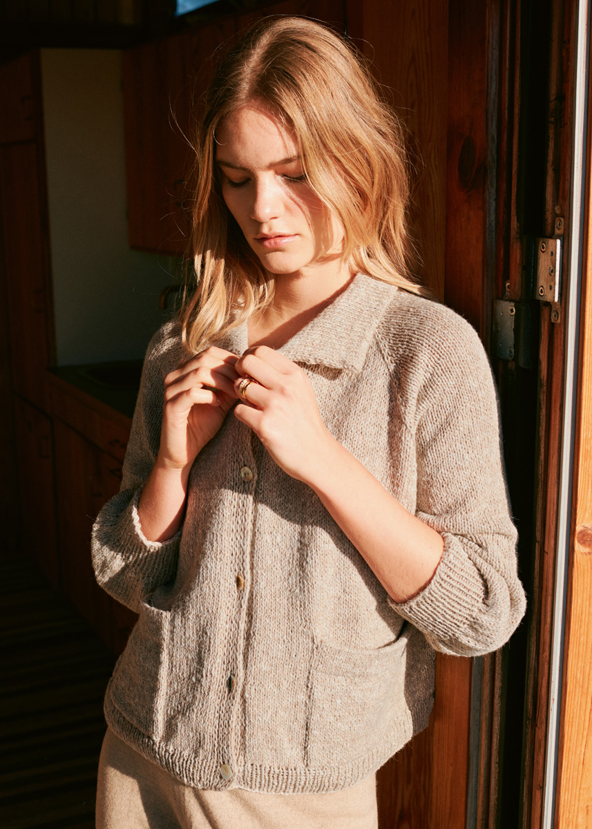 Lana Grossa-kvalitet „Cara” (57 % (baby) alpacka, 33 % bomull, 10 % ren ny ull (merino), löplängd = ca. 120 m/50 g): ca. 450 (500 – 550) g beige (färg 3); stickor nr. 3,5 och 4,5, rundstickor nr. 3,5, 60 och 120 cm lång, rundstickor nr. 4,5, 40, 80 och 120 cm lång, strumpstickor nr. 3,5 och 4,5; 5 pärlemorknappar i natur, ø 15 mm