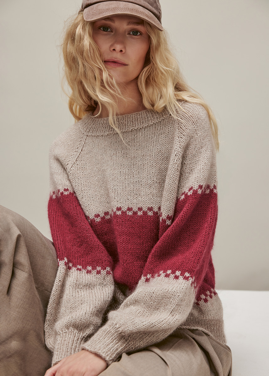 Garn: Lana Grossa Natural Lama Fine (100 % lama (baby), LL = 150 m/50 g): 200 (250 / 250 / 300) g gråbeige (frg 112) og 150 (150 / 200 / 200) g vinrød (frg 117) og Lana Grossa Silkhair (70 % mohair (superkid), 30 % silke, LL = 210 m/25 g): 50 (75 / 75 / 75) g bordeaux (frg 113) og 75 (75 / 100 / 100) g perlebeige (frg 123). Pinner: Rundpinne 4 og 5 mm, 80–100 cm lang (strikk omg med liten omkrets enten med teknikken magic loop en eller en ekstra strømpepinne 4 og 5 mm) Tilbehør: 5 maskemarkører, en av disse i en annen form eller farge for å markere omg begynnelse (TIPS: I starten er det lurt å nummerere maskemarkørene fra 0 til 4, eller fest små etiketter med tall på markørene.)