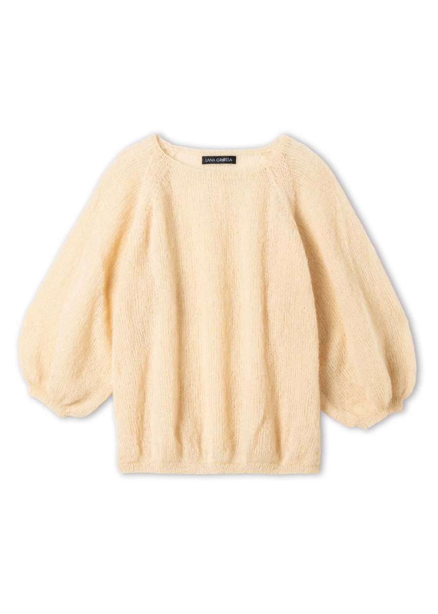 Lana Grossa-kvalitet „Setasuri“ (69 % alpakka (suri), 31 % silke, løpelengde = ca 212 m/25 g): ca 150 (150 - 175 - 175) g lysbeige (farge 58); pinner nr. 3,5 og 4; 1 kort rundpinne nr. 3,5.