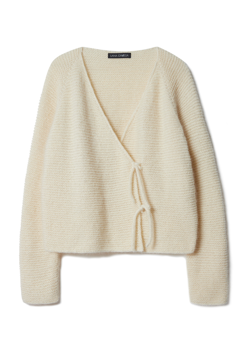 : Lana Grossa-kvalitet „Ecopuno“ (72 % bomull, 17 % ren ny ull (merino), 11 % (baby) alpacka, löplängd = ca 215 m/50 g): ca 300 (300 - 350 - 350) g écru (färg 46), Lana Grossa-kvalitet „Silkhair“ (70 % mohair (superkid), 30 % silke, löplängd = ca 210 m/25 g): ca 150 (150 - 175 - 175) g råvit (färg 52); 1 kort och 1 lång rundsticka nr 4; 4 maskmarkörer; 2 strumpstickor nr 4; 1 virknål nr 4.