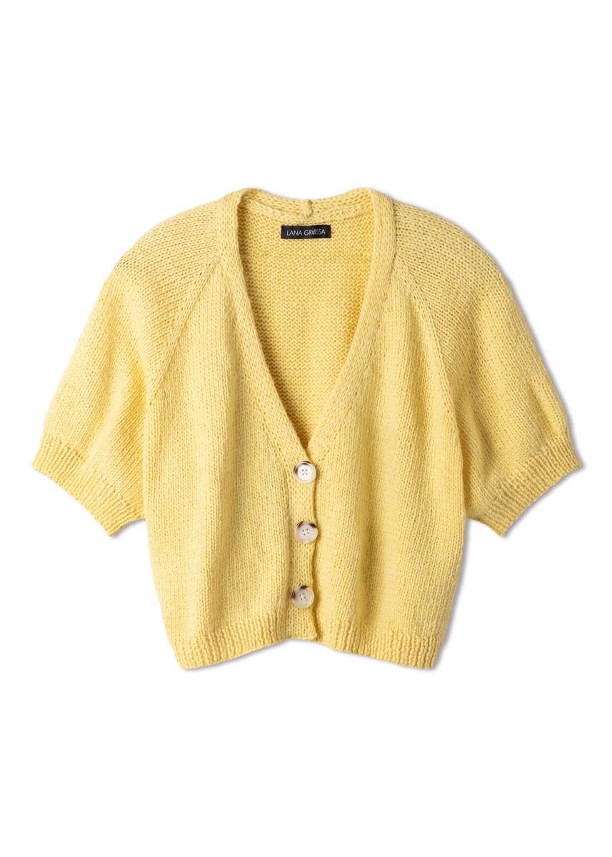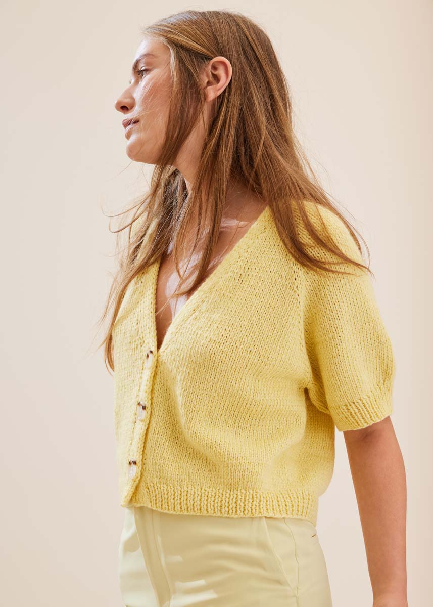 Lana Grossa-kvalitet „Summer Softness“ (80 % bomull (bio), 20 % ren ny ull (superfin merino), löplängd = ca 130 m/50 g): ca 300 (350 - 350 - 400) g gul (färg 11); stickor nr. 4 och nr. 6; 3 knappar i beige, diameter ca 28 mm, artikel-nr. 454230 från Union Knopf.