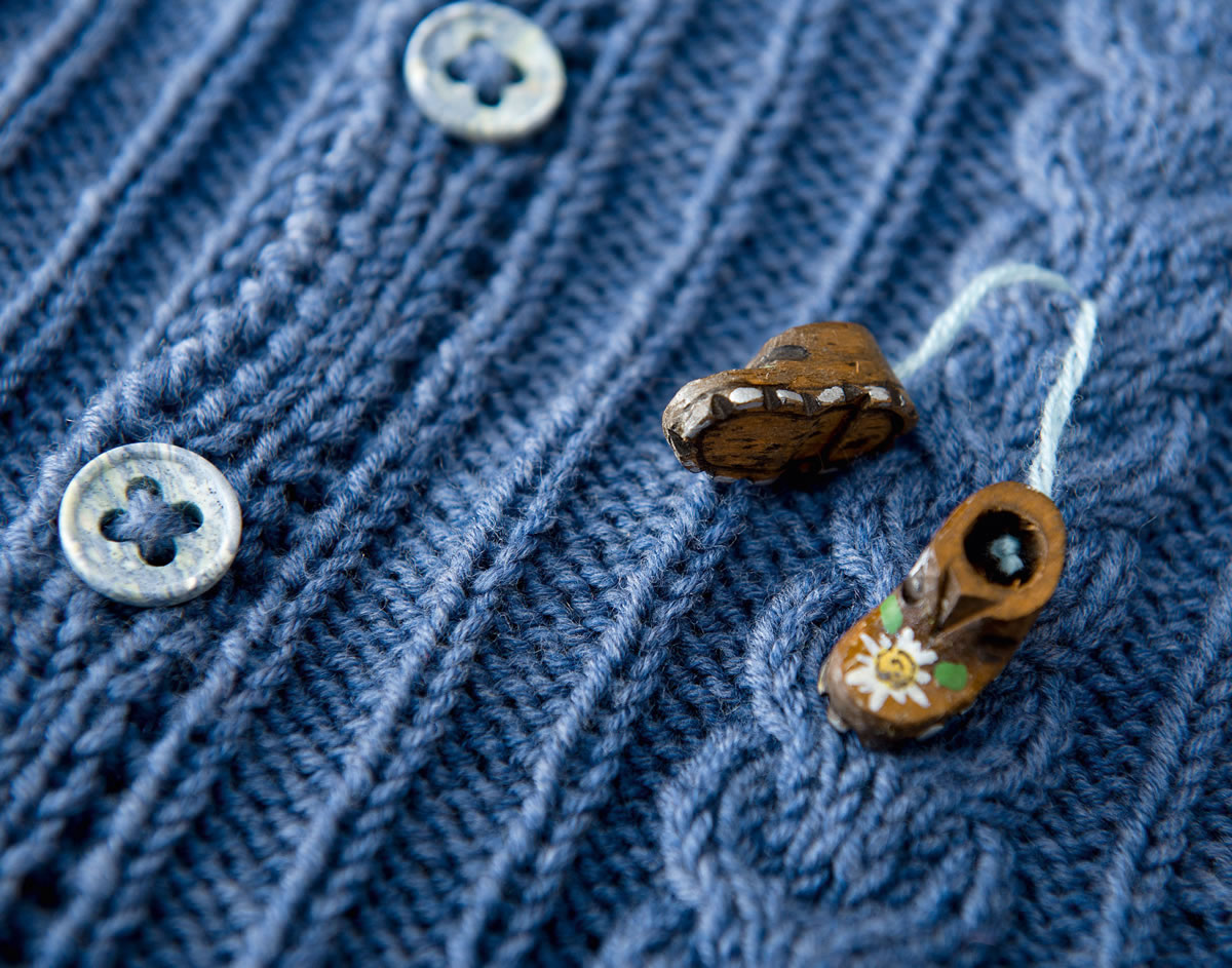 Lana Grossa Cool Wool Big Melange (100 % Schurwolle, Lauflänge 120 m/50 g); 250 (250/300) g Jeans meliert (Fb 328) und 50 g Mint meliert (Fb 333); Stricknadeln Nr. 4,5, eine 40 cm lange Rundstricknadel Nr. 4,5, vier Knöpfe, 2 kleine Schmuck-Holzschuhe.