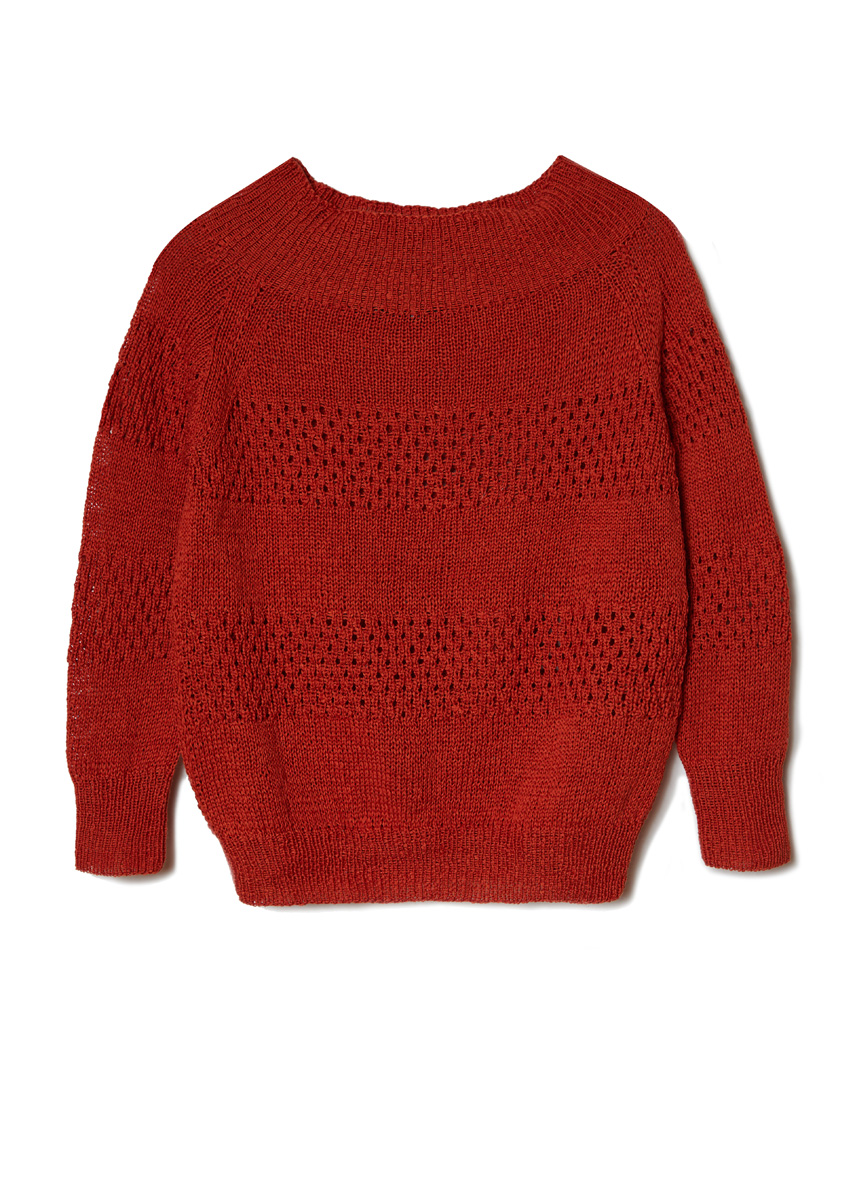 Lana Grossa-kvalitet „Nastrino” (100 % bomull, löplängd = ca. 190 m/50 g): ca. 250 g Terrakotta (färg 12); stickor nr. 2,5, 3 och 4, 1 rundsticka nr. 2,5, 60 cm lång.
