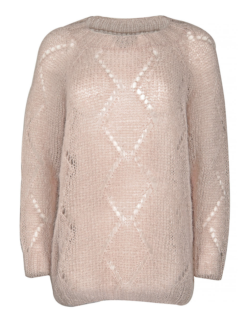 Lana Grossa-kvalitet ”Silkhair Lusso” (78 % (superkid) mohair, 14 % silke, 4 % polyester, 4 % polyamid, löplängd = ca. 210 m / 25 gr.): ca. 100 gr nude (färg 903) och Lana Grossa-kvalitet ”Silkhair” (70 % (superkid) mohair, 30 % silke, löplängd = ca. 210 m / 25 gr.): ca. 100 gr ljus beige (färg 18), stickor nr. 5½ och 9, rundsticka nr. 5½, 60 cm.