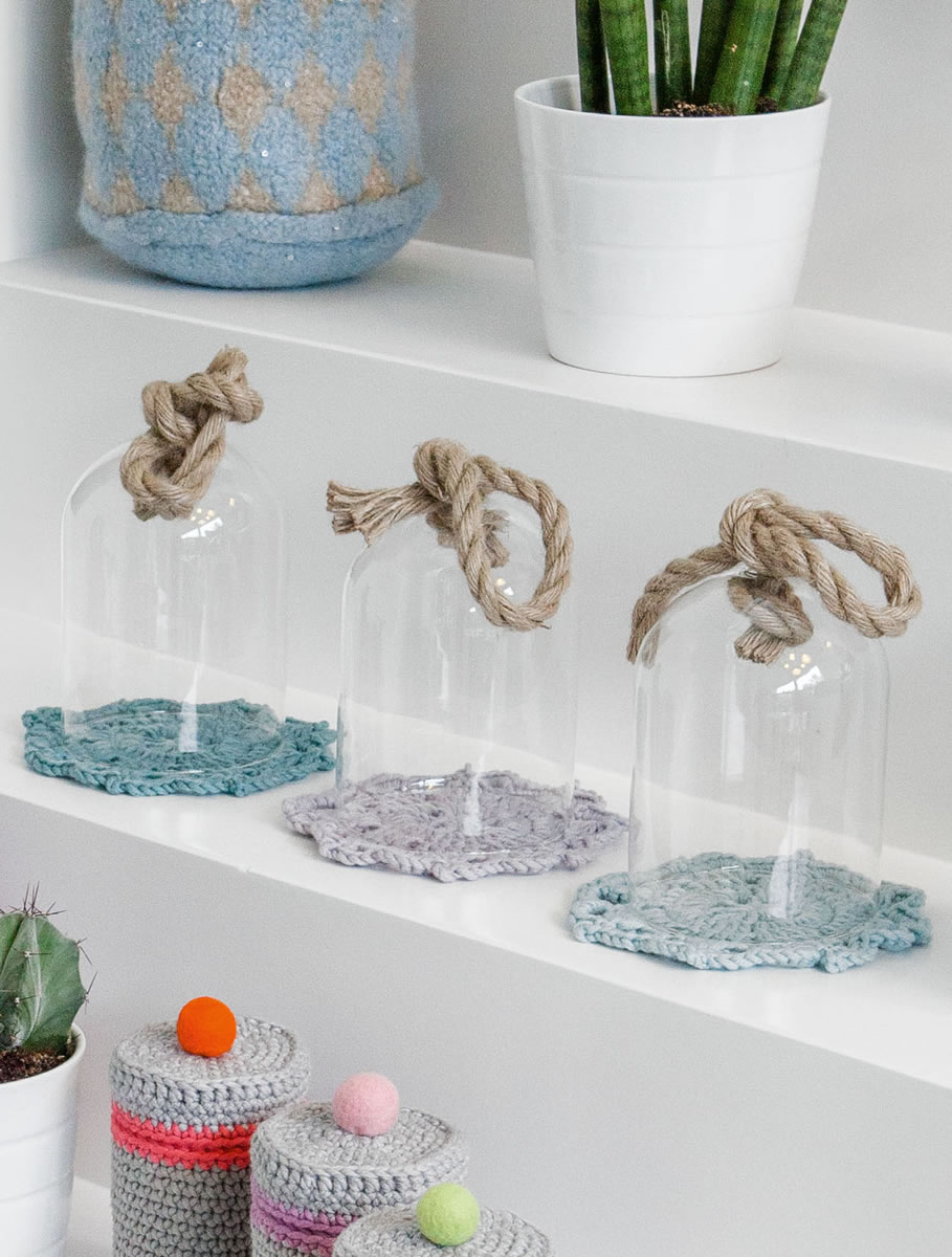 Drunter und drüber: Die Häkelmaschen wirken sowohl als Untersetzer, wie auch als Haube fürs Marmeladenglas herrlich nostalgisch.