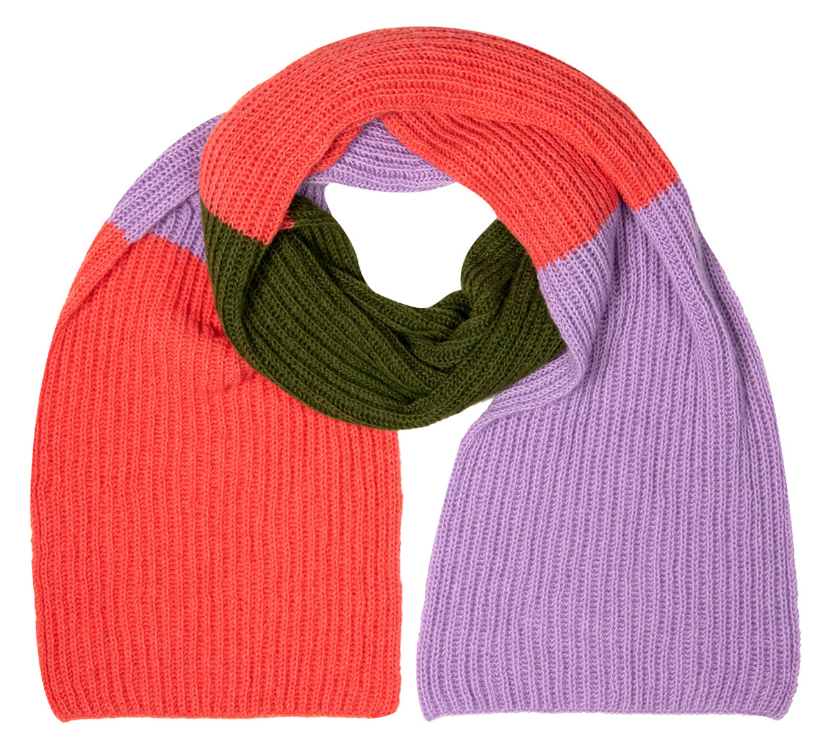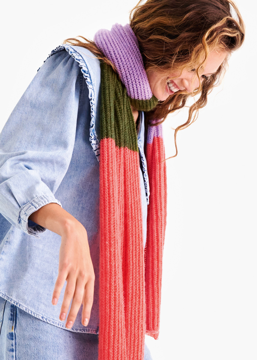 Lana Grossa-kvalitet „Ecopuno” (72 % bomull, 17 % ren ny ull (merino), 11 % (baby) alpacka, löplängd = ca. 215 m/50 g): ca. 100 g var i lila (färg 30) och lax (färg 39) och ca. 50 g mörk olivgrön (färg 54); stickor nr. 3,5.