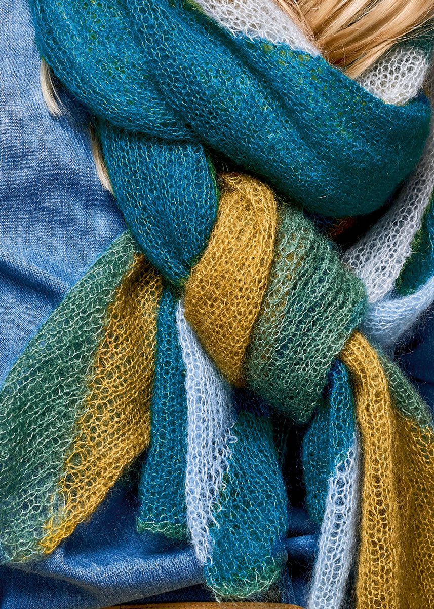Lana Grossa-Qualität „Silkhair“ (70 % Mohair Superkid, 30 % Seide, LL = ca. 210 m/25 g) 50 g Zartblau (Fb 88), 50 g Grüngrau (Fb 81), 50 g Petrol (Fb 23), 50 g Dunkelgrün (Fb 89) und 50 g Senf (Fb 72). Strick-Nd Nr 6.